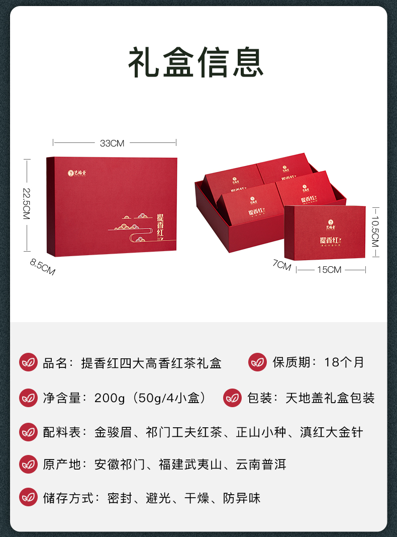 四大高香红茶礼盒,包含祁门红茶、正山小种、有机滇红、金骏眉4种红茶,茶干紧结、口感醇厚、叶底软嫩,每种50g独立罐装,红色描金礼盒,送礼高大上。