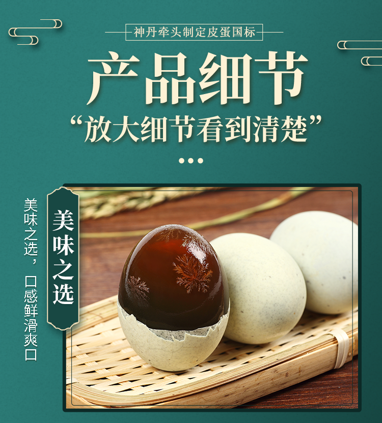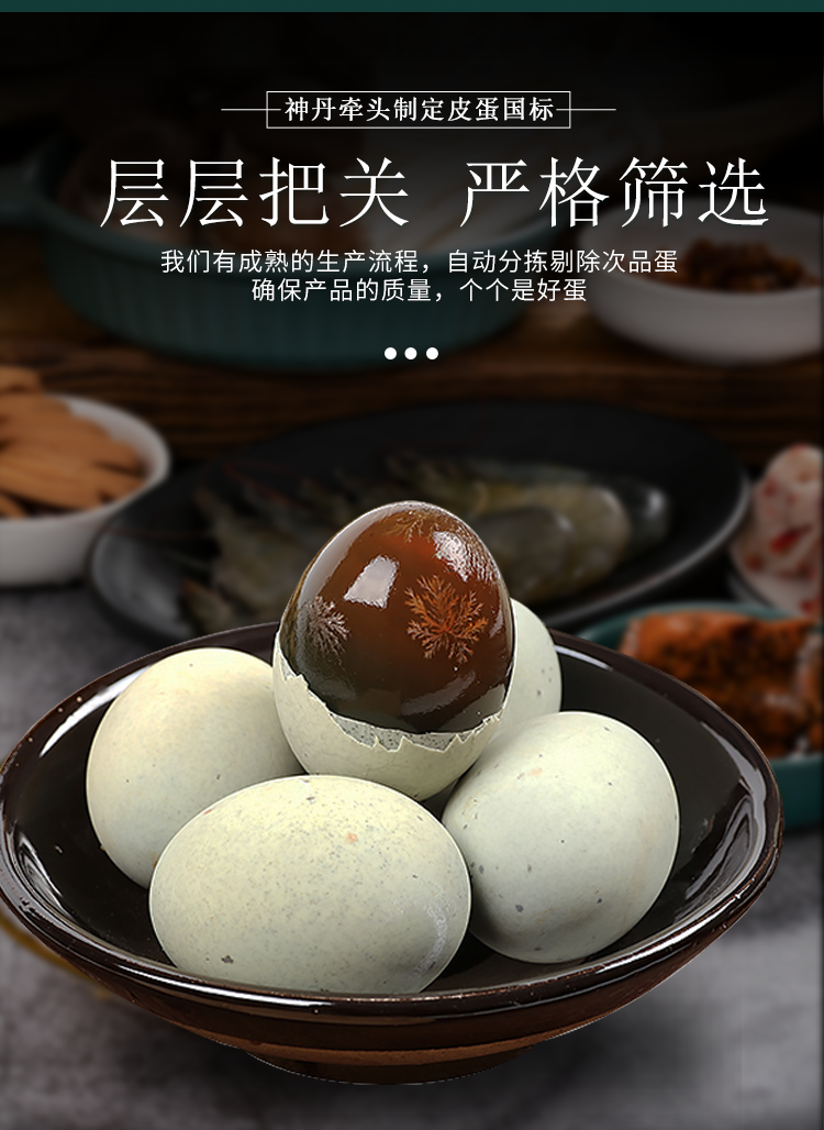 手工秘制,无铅工艺,操作简单,品质口感极佳,营养美味,色泽完美,层次分明。溏心皮蛋包泥疏松,色浅,易剥落。天气渐热,皮蛋非常适合凉拌做凉菜等,美味爽口,下酒好菜,还可以煮皮蛋瘦肉粥等,别有风味。