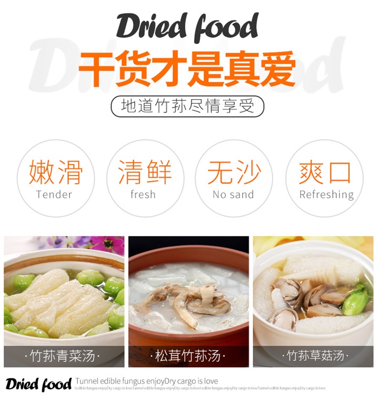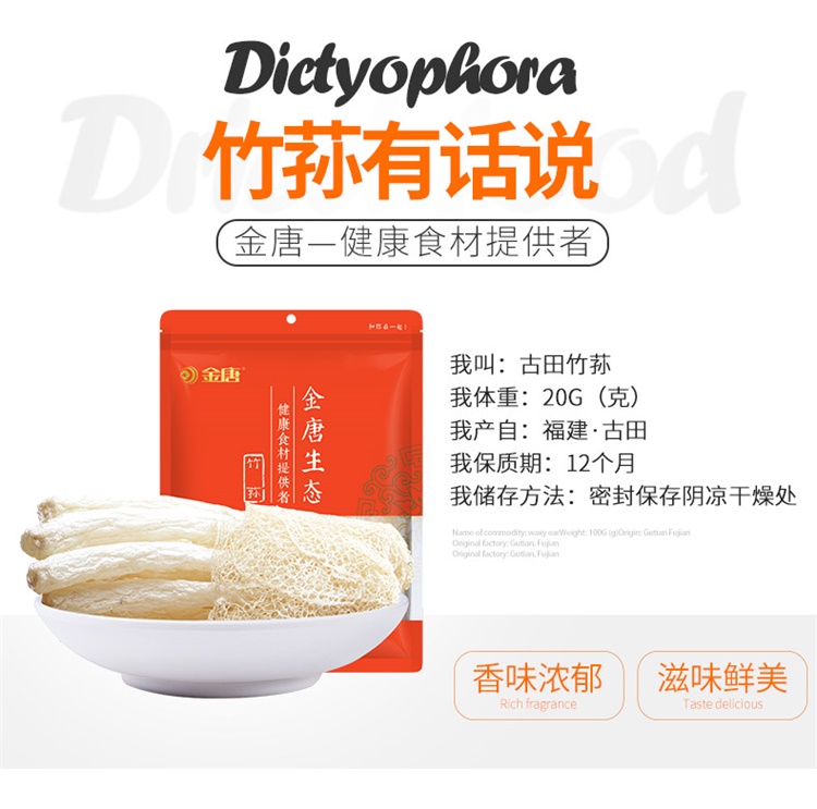 这款金唐无硫熏竹荪干货,产地是福建古田,选用优质新鲜竹荪经慢火烘干而成,不用硫熏,使竹荪呈自然的淡黄色,同时完美的锁住营养精华,最后是8比1的制干比例。