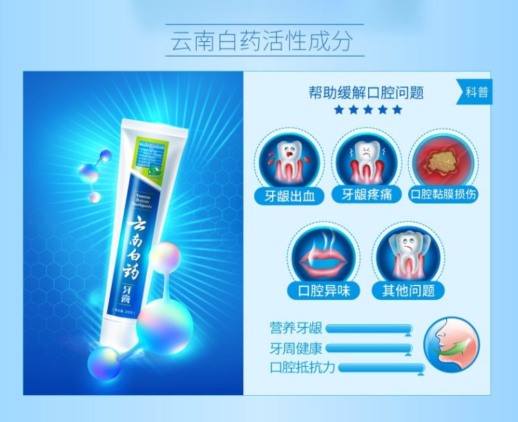 这款云南白药 牙膏 全家福6支套装,包含薄荷清爽100g、留兰香型 100g、益优冰柠 105g*2、益优薄荷 145g、清新晨露100g。遇难白牙活性成分,帮助缓解各种口腔问题。