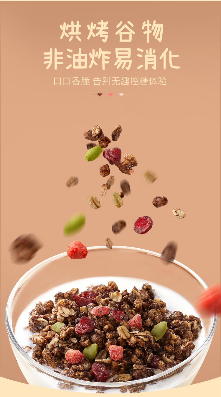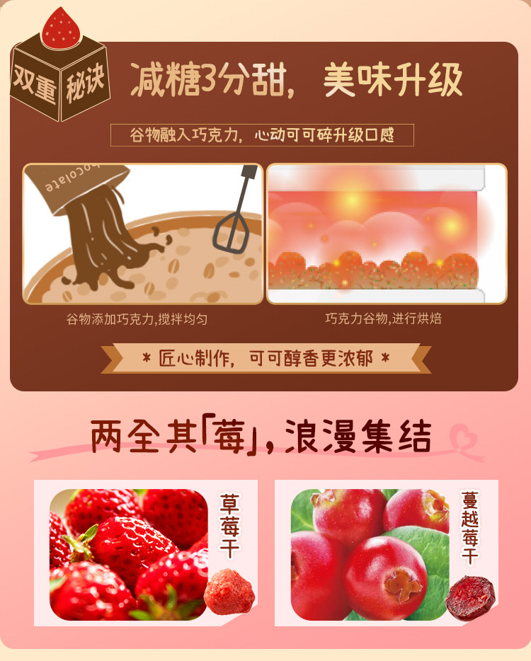 卡乐比今年新品,可可莓莓口味,减糖3分甜,好吃又健康,优选多种谷物,添加天然可可进行烘焙,升级口感,再加入草莓干和蔓越莓干,入口香香脆脆,健康好吸收,同时富含人体所需的多种维生素和微量元素,营养健康又好吃。