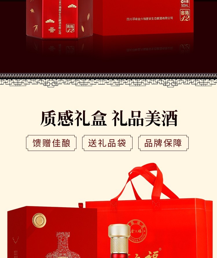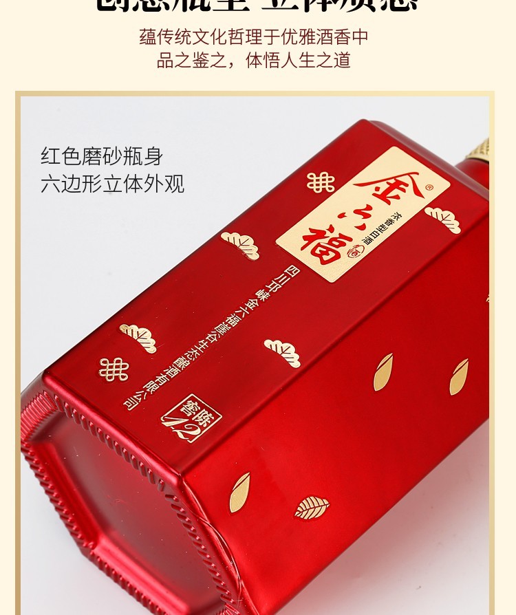 金六福窖陈12是四川邛崃金六福崖谷生态酿酒有限公司出品的一款中端浓香型白酒。采用富钾纱滤矿泉水,高粱、小麦、大米、糯米、玉米、五粮纯粮酿造,陶坛存储历经岁月洗礼,陈酿増香、老酒为基、口感醇厚丰满,低而不淡、较柔和顺口。红色磨砂瓶身六变形立体外观,包装和酒瓶都比较喜庆,非常适合过节时招待客人。