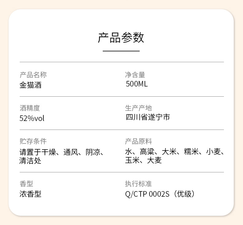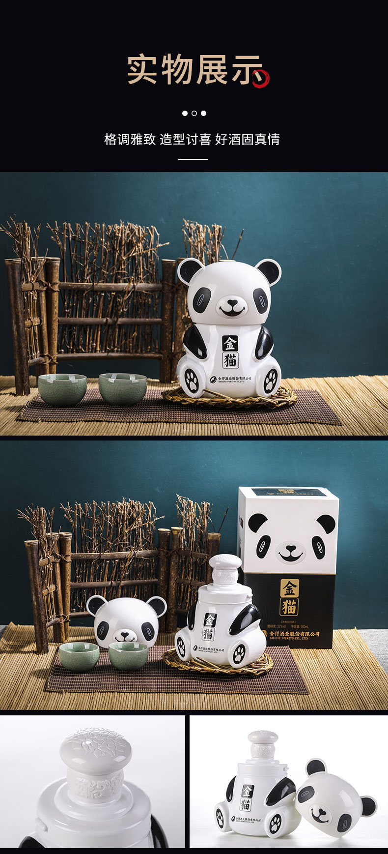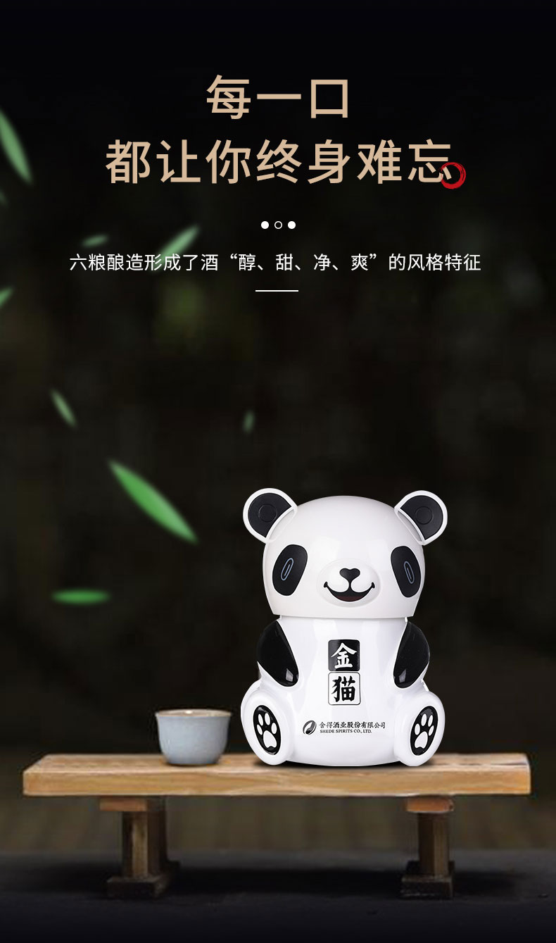 悠悠岁月酒、滴滴沱牌情。这款舍得 舍得 金猫 52度浓香型白酒,由四川沱牌舍得酒业股份有限公司出品,臻选优质高粱、大米、糯米、玉米、小麦、大麦六粮工艺,比传统五粮增加大麦,酿出的酒更粮香怡人,柔顺醇厚,回味悠长。瓶体设计采用国宝熊猫造型,萌趣可爱,酒精度52%vol,净含量500ml/瓶。