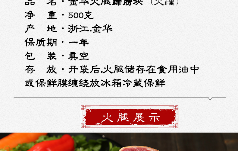 金华火腿又称火朣,浙江金华地方传统名产之一,具有俏丽的外形,鲜艳的肉,独特的香,悦人的风味,即色、香、味、形“四绝”而著称于世,为中国腌腊肉制品中的精华。领券链接点此