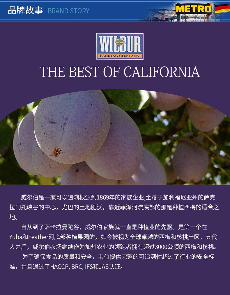 威尔伯是家可以追溯根源到1869年的家族企业,是第一个在Yuba和Feather河底部种植果园的,如今被视为全球卓越的西梅和核桃产区。作为加州农业的领跑者拥有超过3000公顷的西梅和核桃。为了确保食品的质量和安全,韦伯提供完整的可追溯性超过了行业的安全标准,并且通过了HACCP, BRC, IFS和JAS认证。