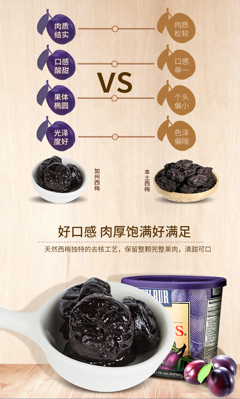 Wilbur去核西梅干,美国加州进口,本地源头制作,收获过程中不碰触地面,当天立即进行控制化的脱水加工流程,所以西梅表皮柔软,口味一致性的香甜,无添加香料及人工色素,零脂肪,零胆固醇,营养无负担。