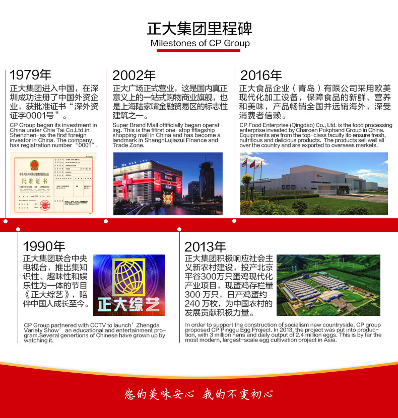 正大食品是正大集团旗下的一个食品品牌,包括鸡鸭猪等生鲜和熟食系列产品。采用荷兰、美国等国家的先进加工设备,保证了食品的新鲜、营养和美味,符合现代生活需要,畅销全国并远销海外市场,深受消费者信赖。国家体育总局训练局运动员专用产品。正大集团旗下一条龙企业生产的“双大”牌、“正大秦皇”牌、“德大”牌鸡肉为中国名牌产品。