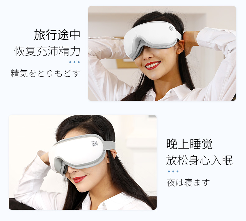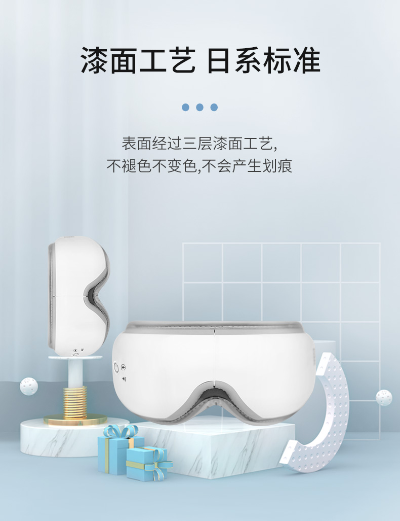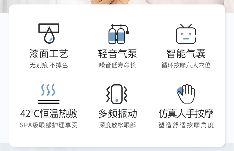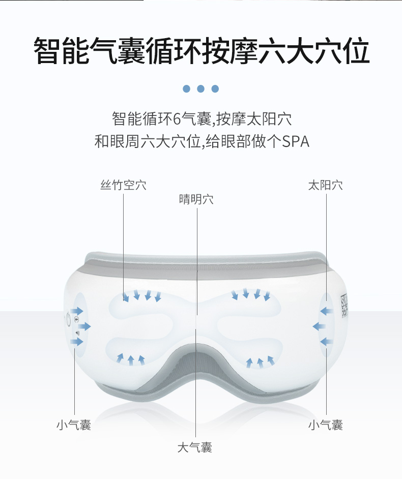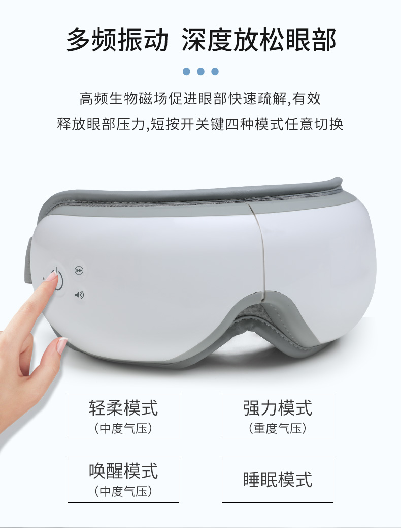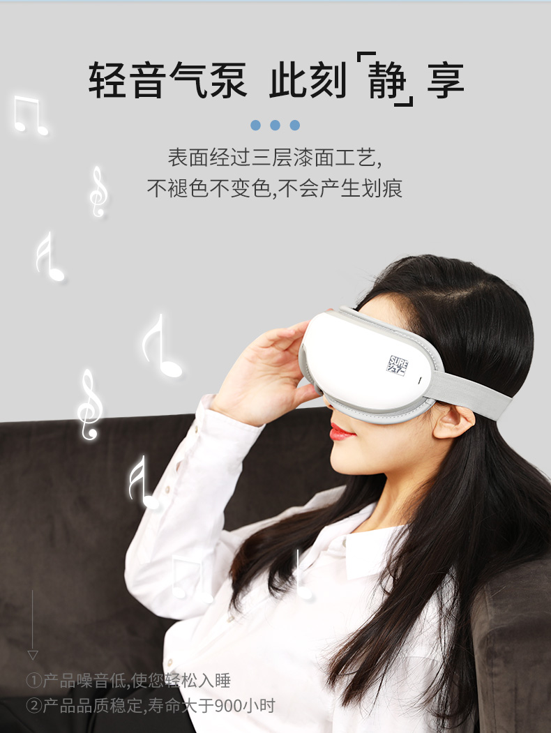 功能上:智能气囊按摩六大穴位,多频震动放松眼部、轻音气泵,噪音低寿命长,配合高频生物磁场促进眼部快速疏解,有效释放眼部压力,有轻柔模式、强力模式、唤醒模式、睡眠模式共四种模式任意切换;42°恒温发热,SPA级眼部护理享受,加速血液循环,辅助按摩,可快速缓解疲劳。