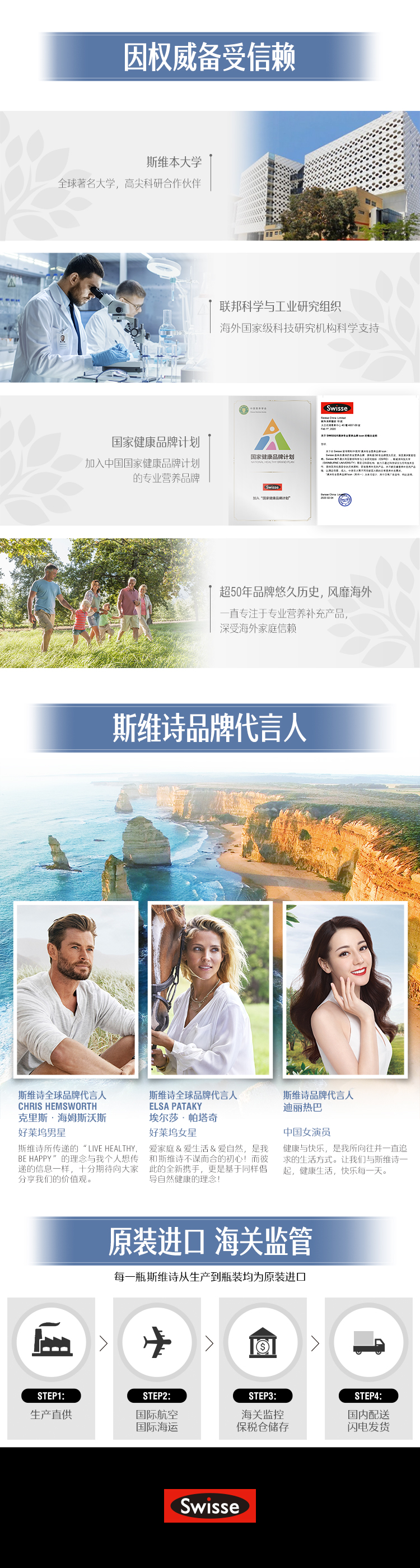 Swiss是近两年风头很盛的自然健康品牌,于1960年在澳大利亚墨尔本创建,号称澳洲顶级保健品,同时也是澳洲自然医学疗法的先驱之一,公司主旨是倡导缔造健康和高品质生活,有超过25年的科学研究和临床试验的基础,其原料采购和生产工艺均通过全球最高处方药的生产标准TGA。
