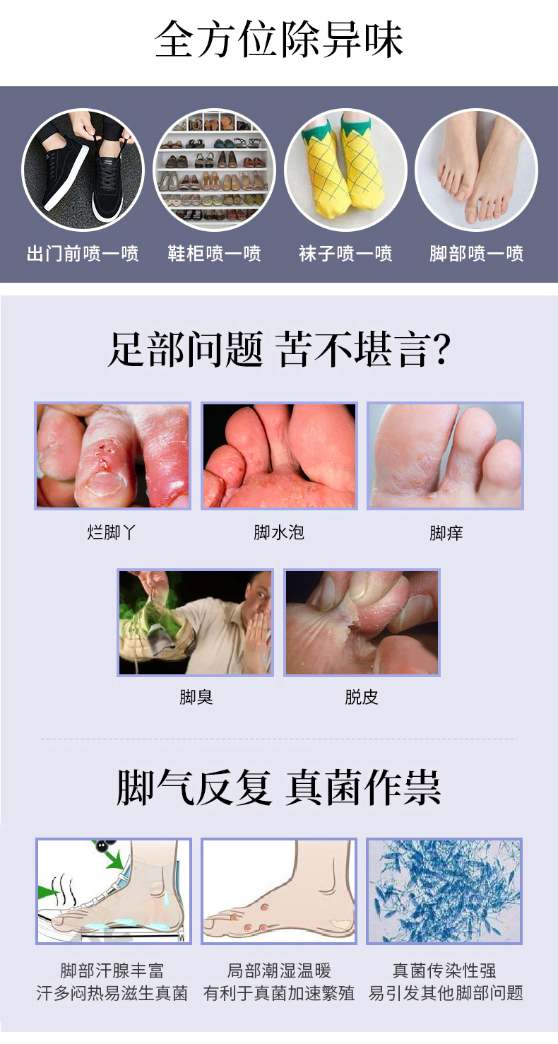 高效抑菌止痒,快速除臭,安全无激素,无腐蚀性无毒更安全。喷雾式设计,可以用于喷洒在足部患处-趾间型、角化型、小水疱型脚气足癣等,或者袜子、鞋内、鞋柜内。