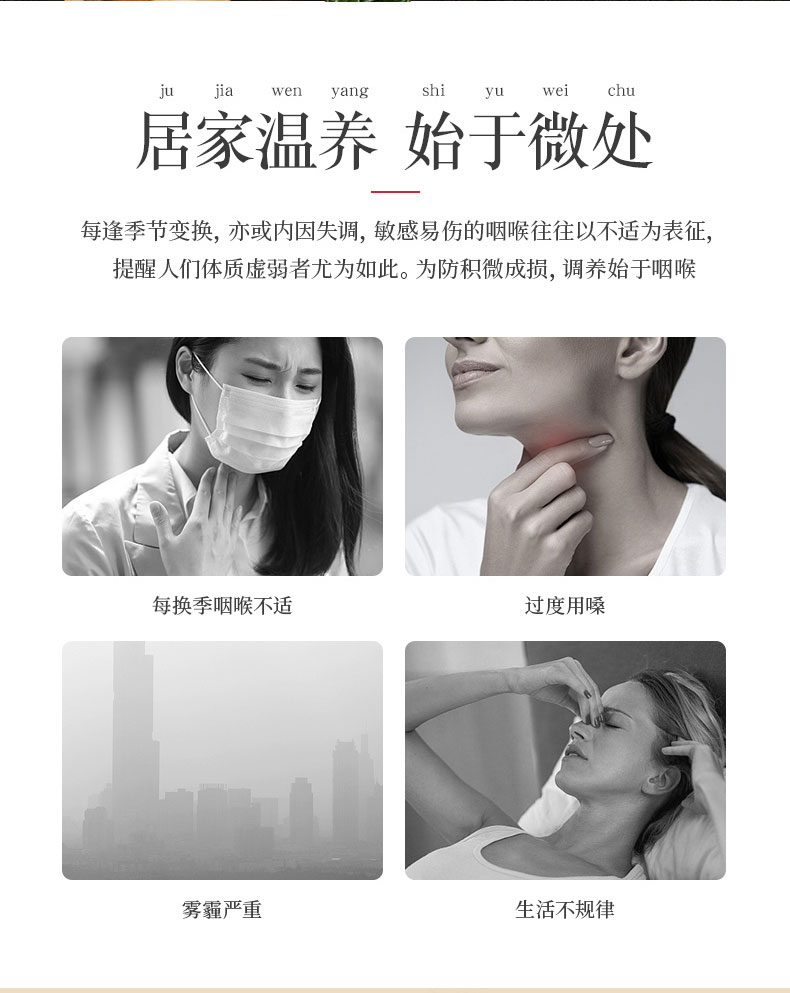 这款无糖枇杷膏 可以润肺止咳,清热退火。严选天然草本,不含防腐剂,无糖高纤,糖分摄入限制者也可放心食用,抗菌护喉,双效加强。里面还特别添加了金银花、橄榄叶,清凉降火。生活中,过度用嗓、环境影响、作息不规律、抽烟引起喉咙不适、饮食刺激、应酬多多,都会导致咽喉伤痕累累。