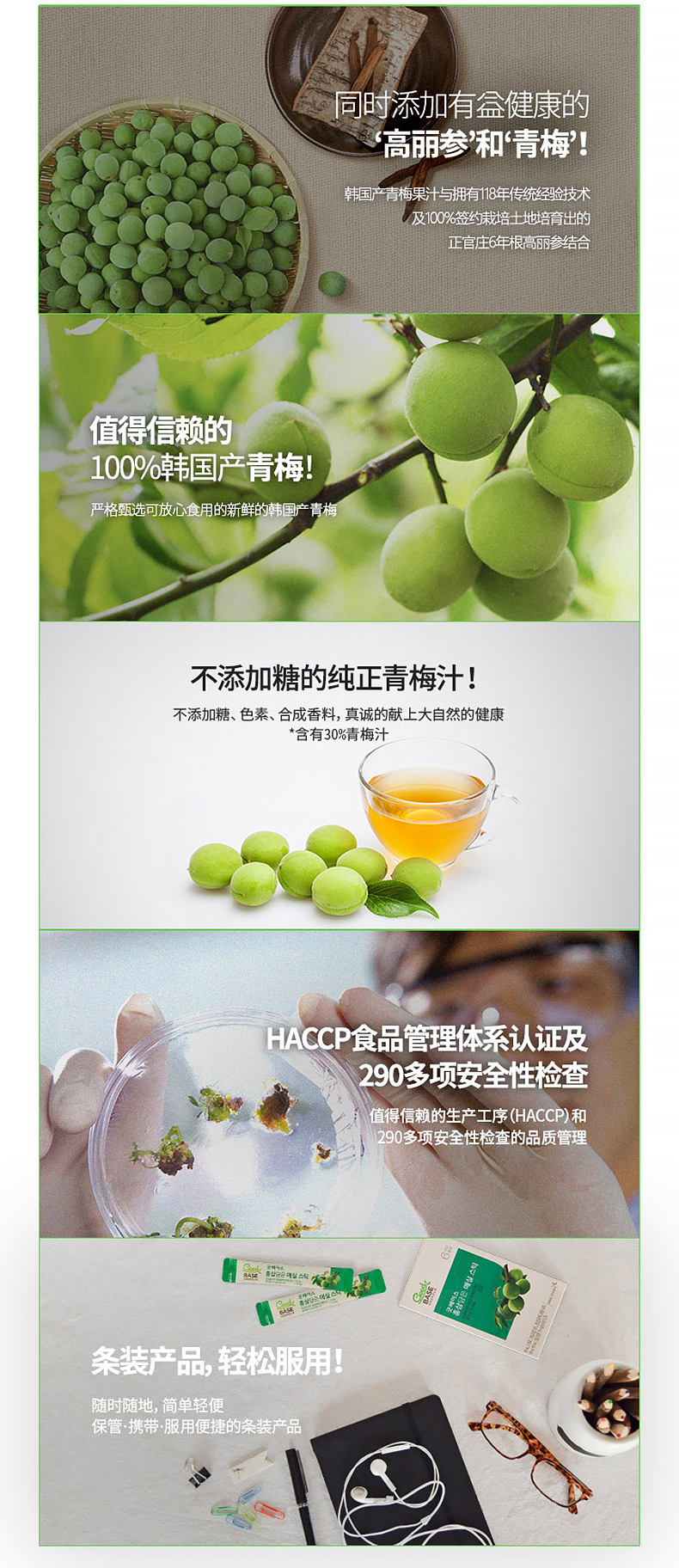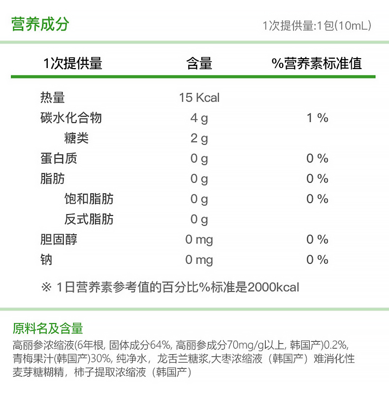 这款正官庄高丽参青梅浓缩液,韩国原装进口,由青梅浓缩液 30%、高丽参浓缩液0.2%、纯净水为原料制成,不添加糖、色素和合成香料,能改善新陈代谢,提高抵抗力增强体质、补充身体微量元素。