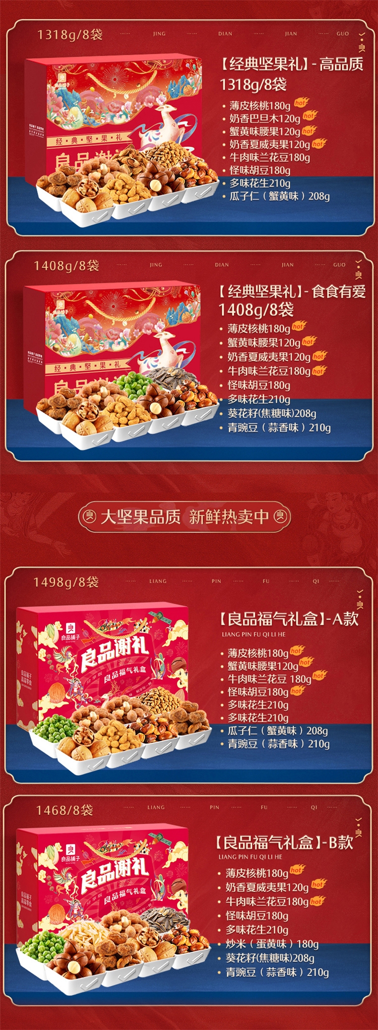 天猫良品铺子高端手礼旗舰店99元,下单立减35.05元,可领15元优惠券,实付48.95元到手,良品铺子的含4袋纯坚果礼盒1318g/8袋坚果礼盒,新货上市,多种搭配,量多实惠,8袋分量超足,敦煌联名卡,新货上市,赶紧速囤!为元旦、春节送礼提前做准备。领券链接点此