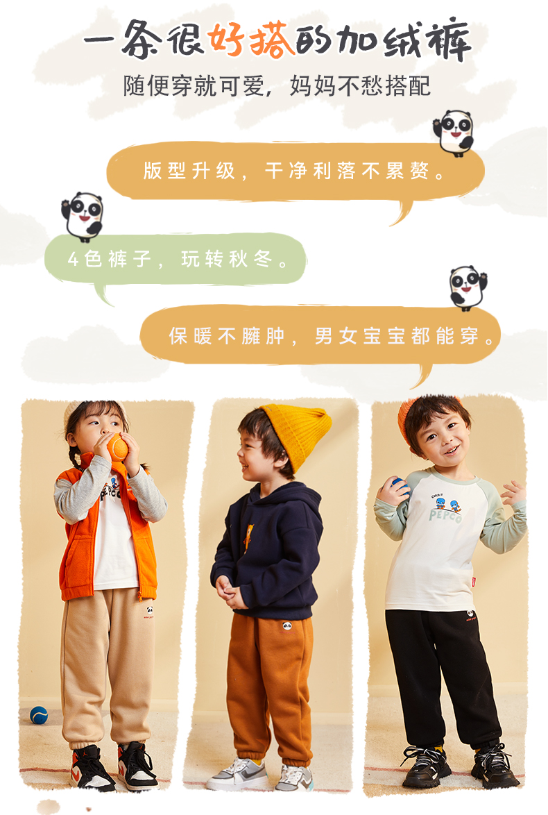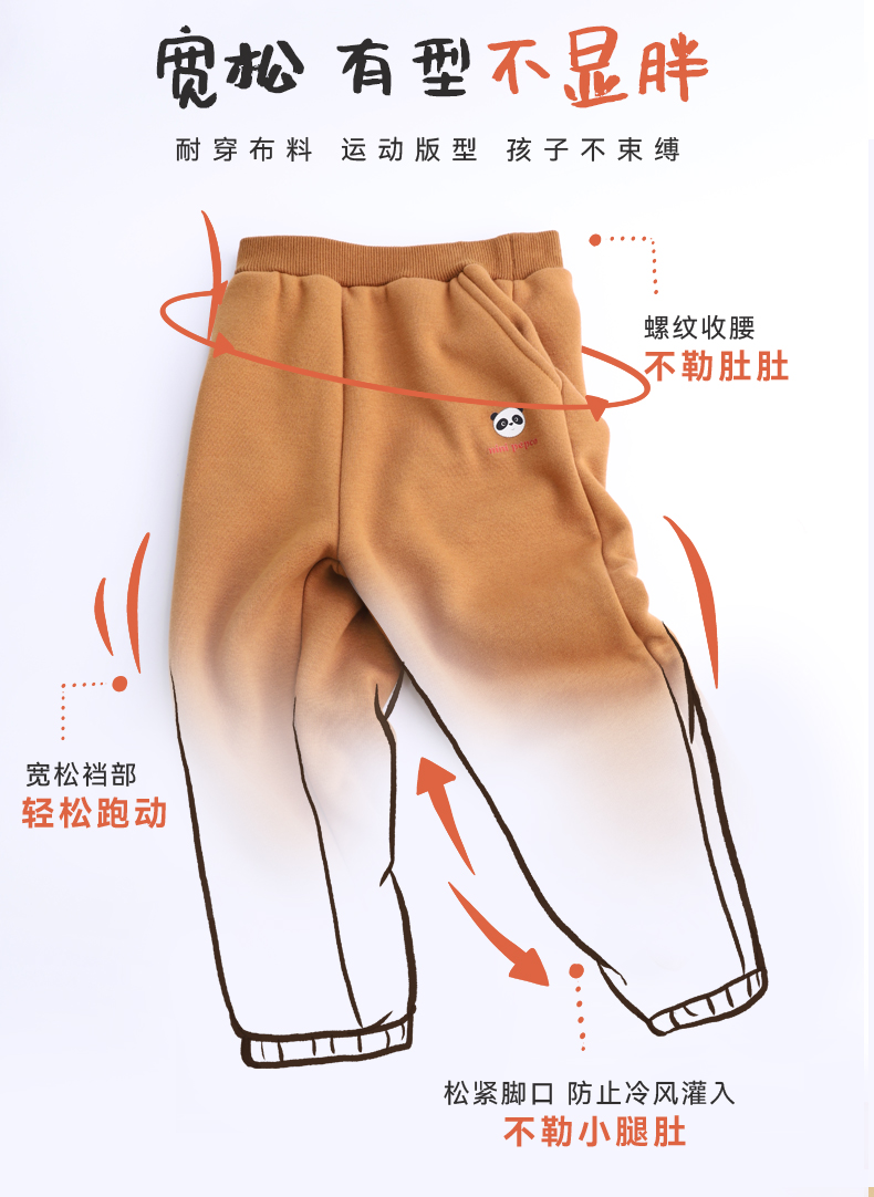 这款小猪班纳 冬季新款男女童加绒保暖运动长裤,耐穿布料,运动版型,孩子不束缚,宽松有型不显胖;加绒加厚,看得见的温度;松紧脚口,防止冷风灌入,不勒小腿肚;一条很好搭的加绒裤,随便穿就可爱,保暖不臃肿,妈妈不愁搭。