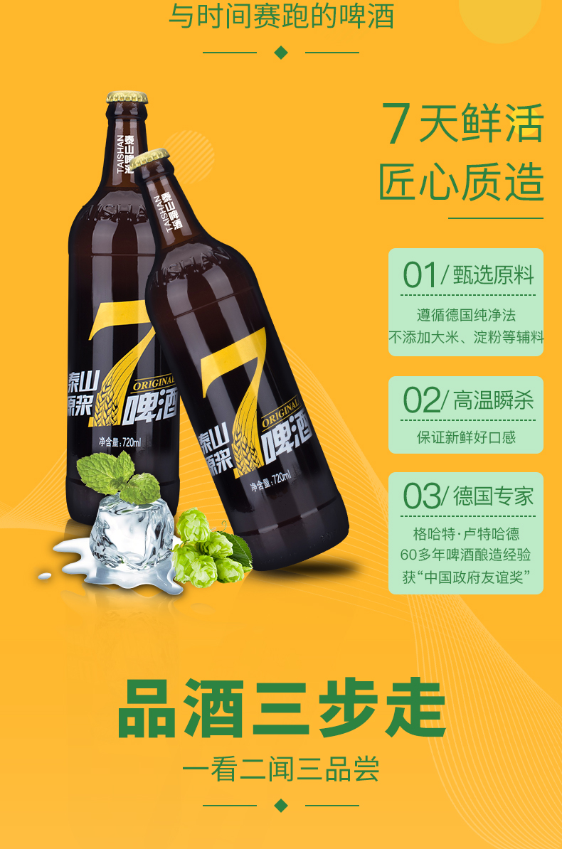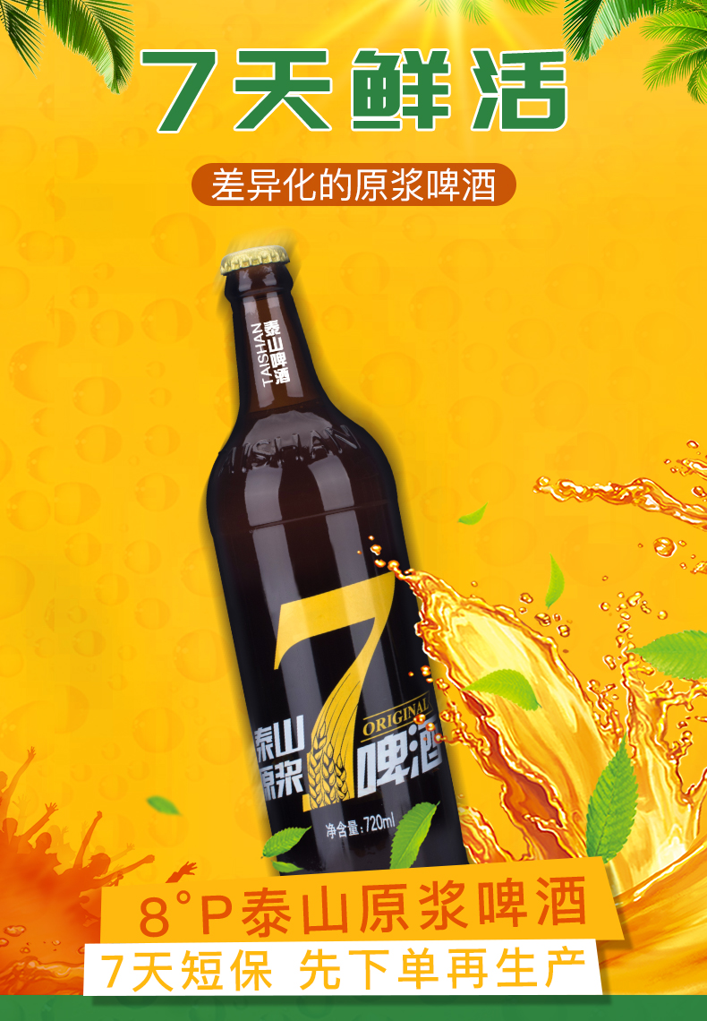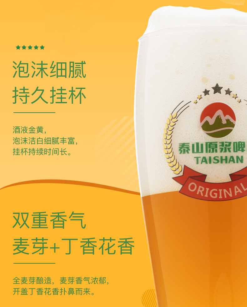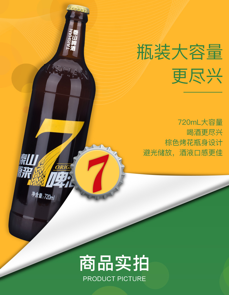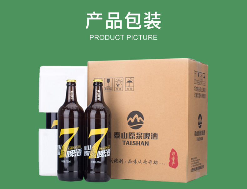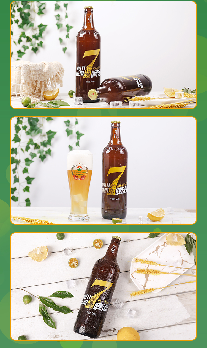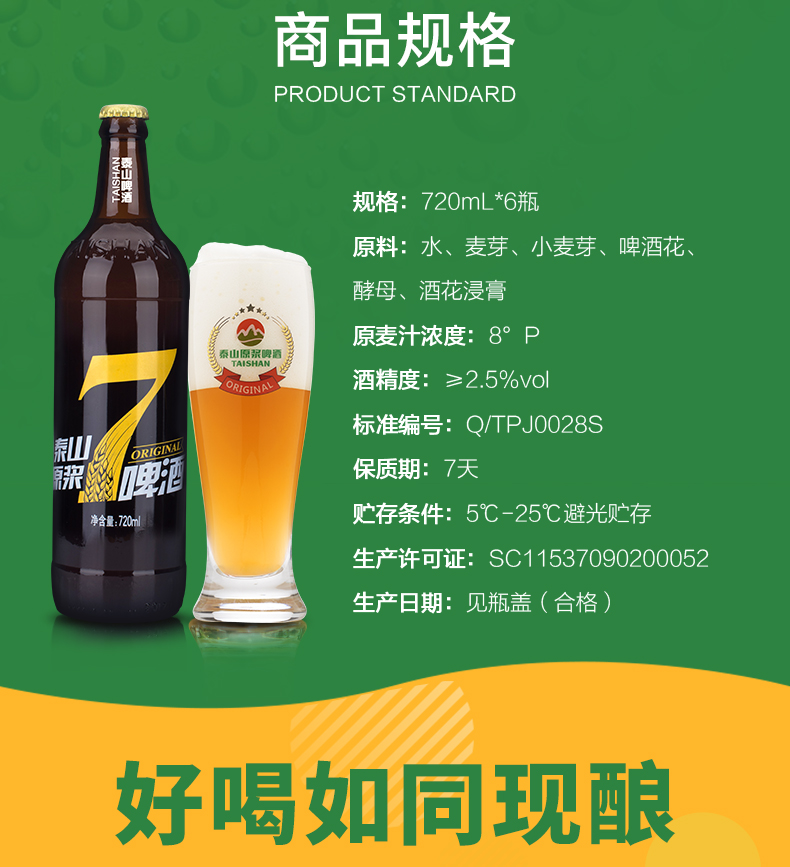 这款泰山啤酒 8°P 7天原浆啤酒,720ml大瓶装装,使用德国设备和发酵工艺,精选澳洲大麦、新疆啤酒花、德国上面酵母及泰山地下水酿造而成,酒精度≥2.5%vol,原麦汁浓度8°P,未经过滤,保留酵母,好喝如同现酿,口味纯正干爽,泡沫丰富。