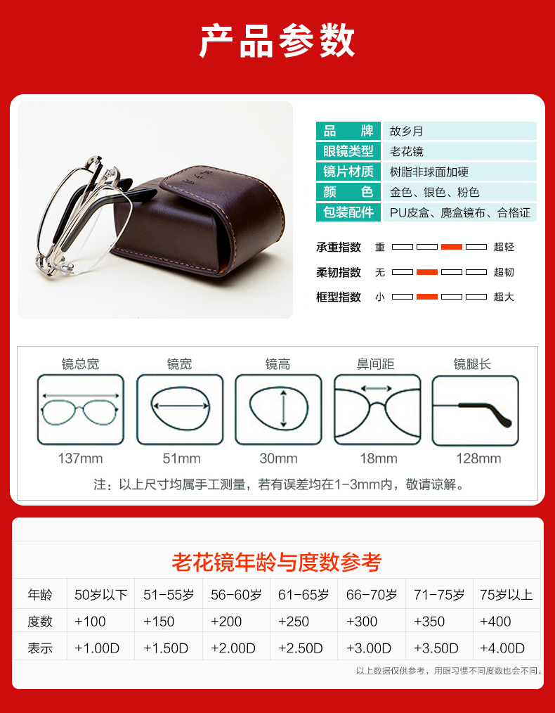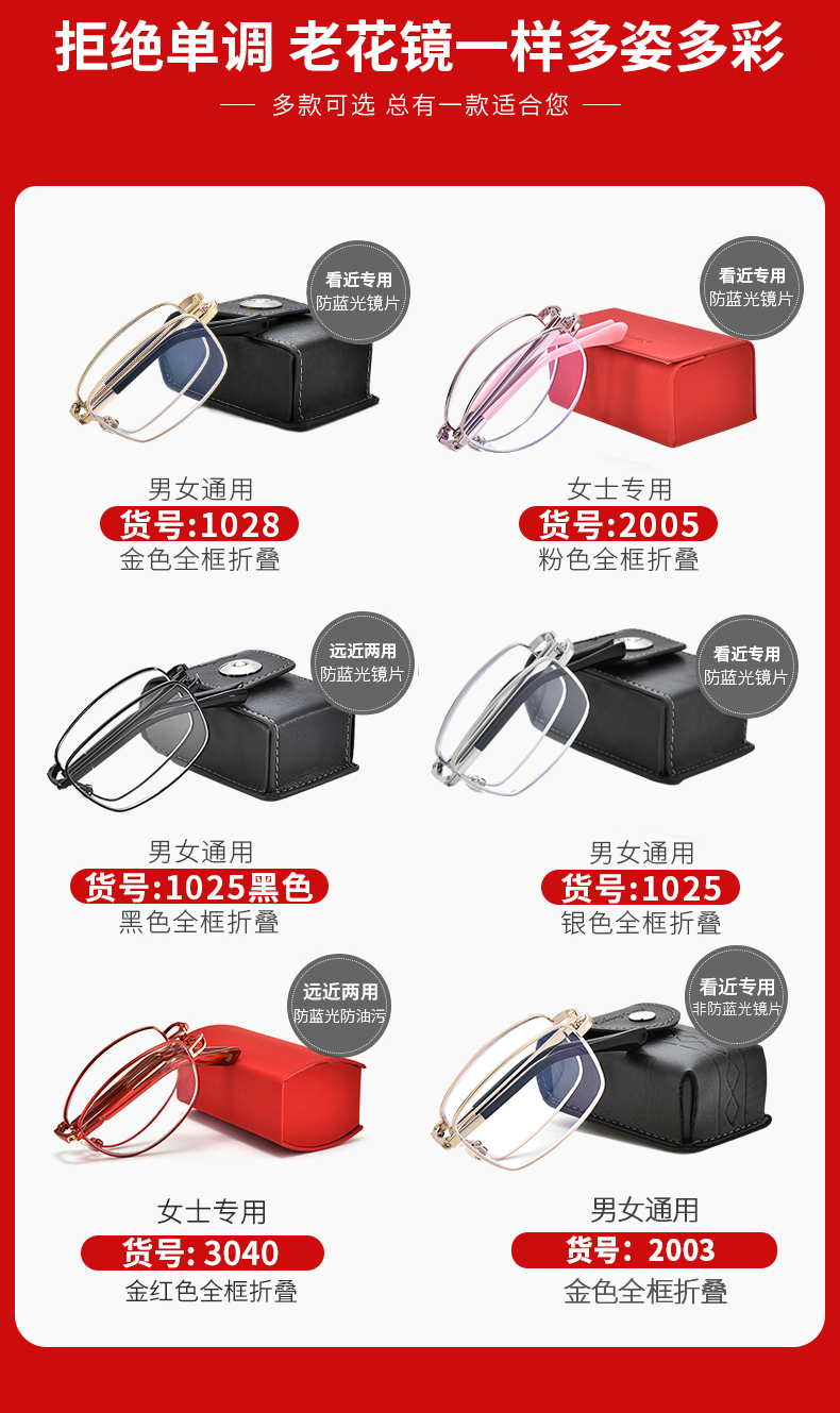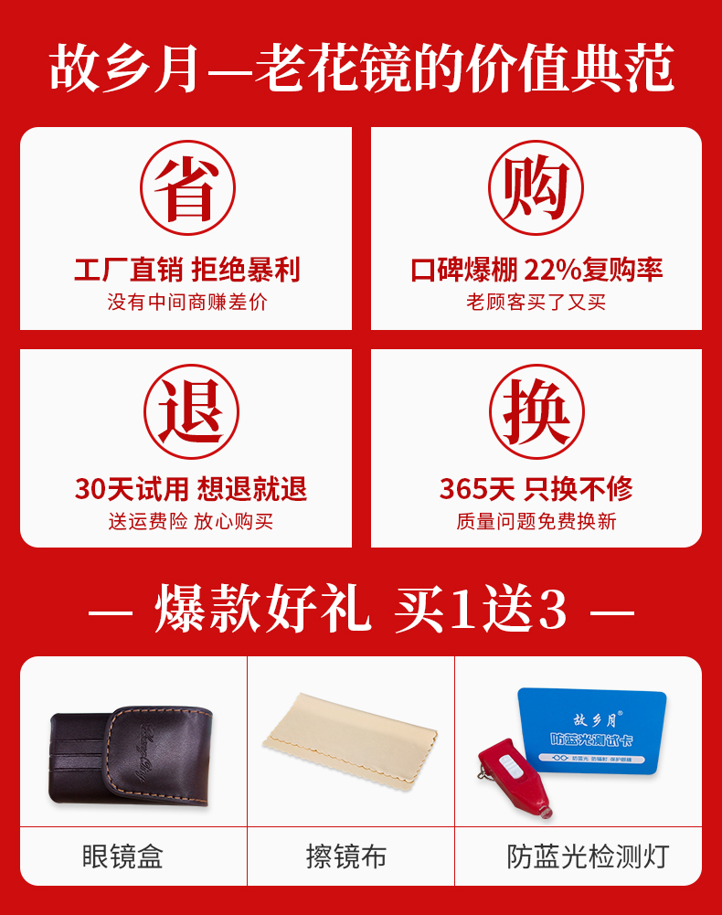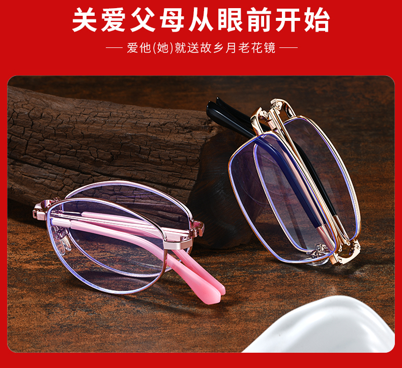 这款故乡月可折叠超轻防蓝光老花镜,经过不断优化升级,相比于普通的防蓝光镜片,具有更好的透光率和色彩还原度,佩戴高清舒适护目,颜色不失真,不泛黄。可折叠全框镜架,小巧便携。