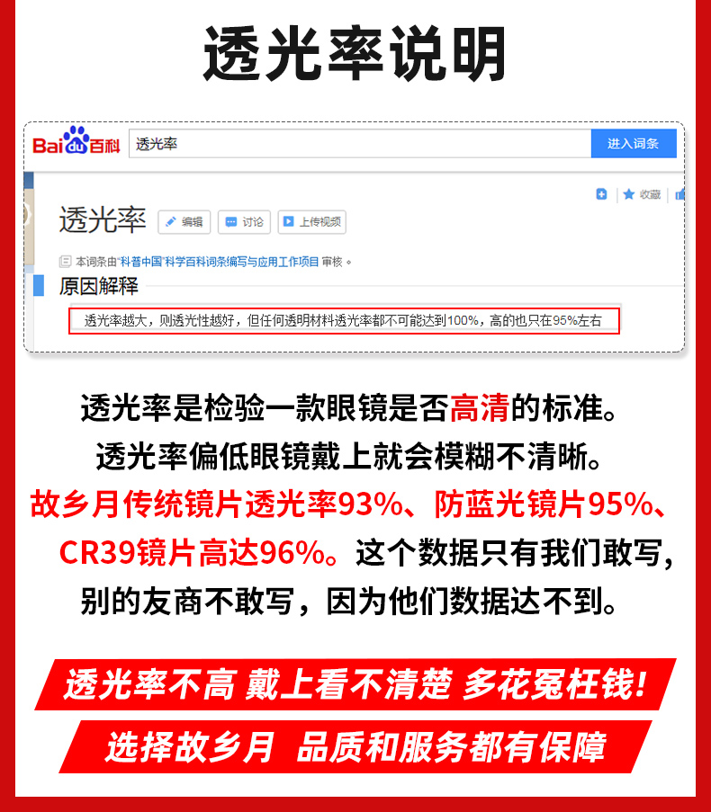 故乡月传统镜片透光率93%、防蓝光镜片95%、CR39镜片高达96%,透光率越高镜片越清晰。