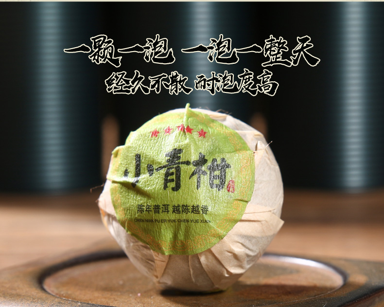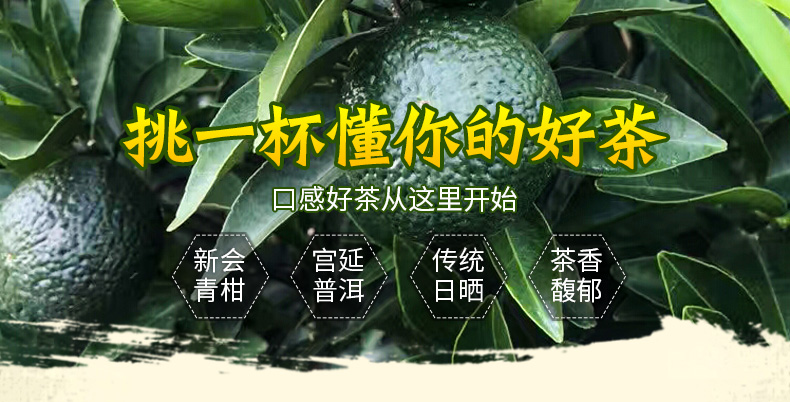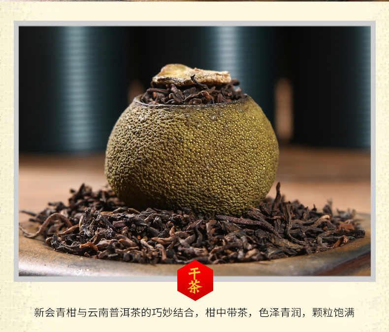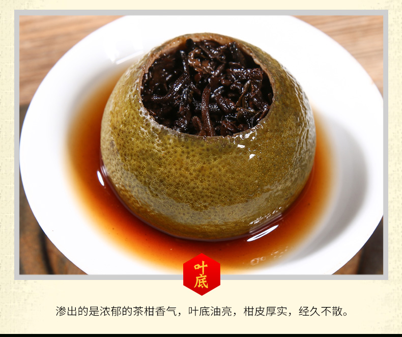 优选新会新鲜的的柑果,和源自云南勐海的陈年普洱,金芽微漏,拒绝茶梗,让柑果与普洱香充分交融,不用任何技术催化,冲泡出的桔普茶,口感醇厚润滑,清甜润泽,柑皮厚实,叶底油亮,果香浓郁,一颗可泡一整天。