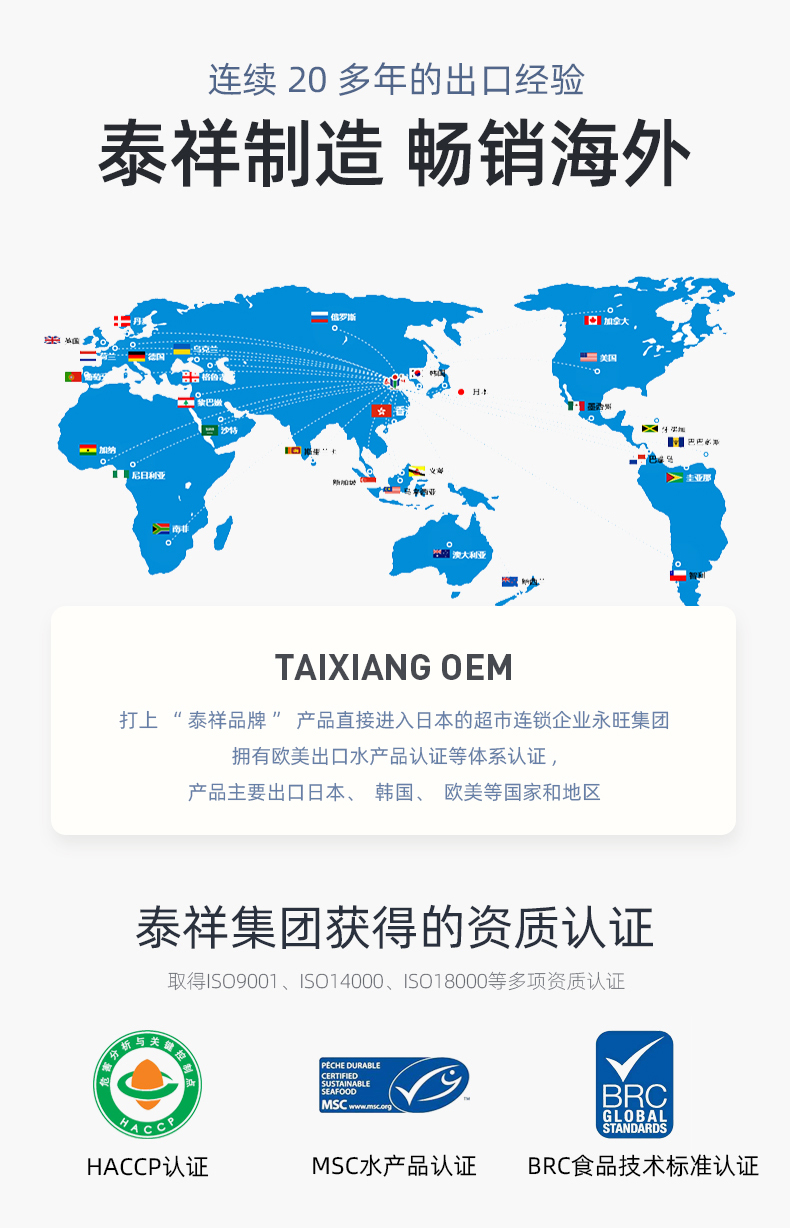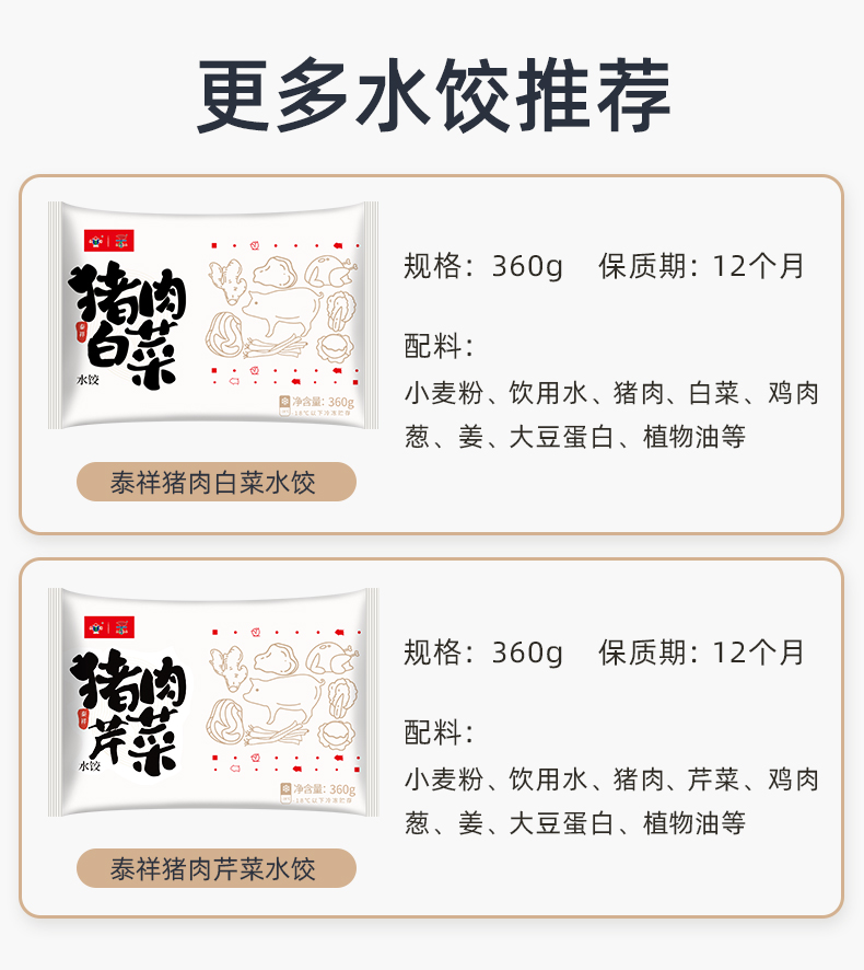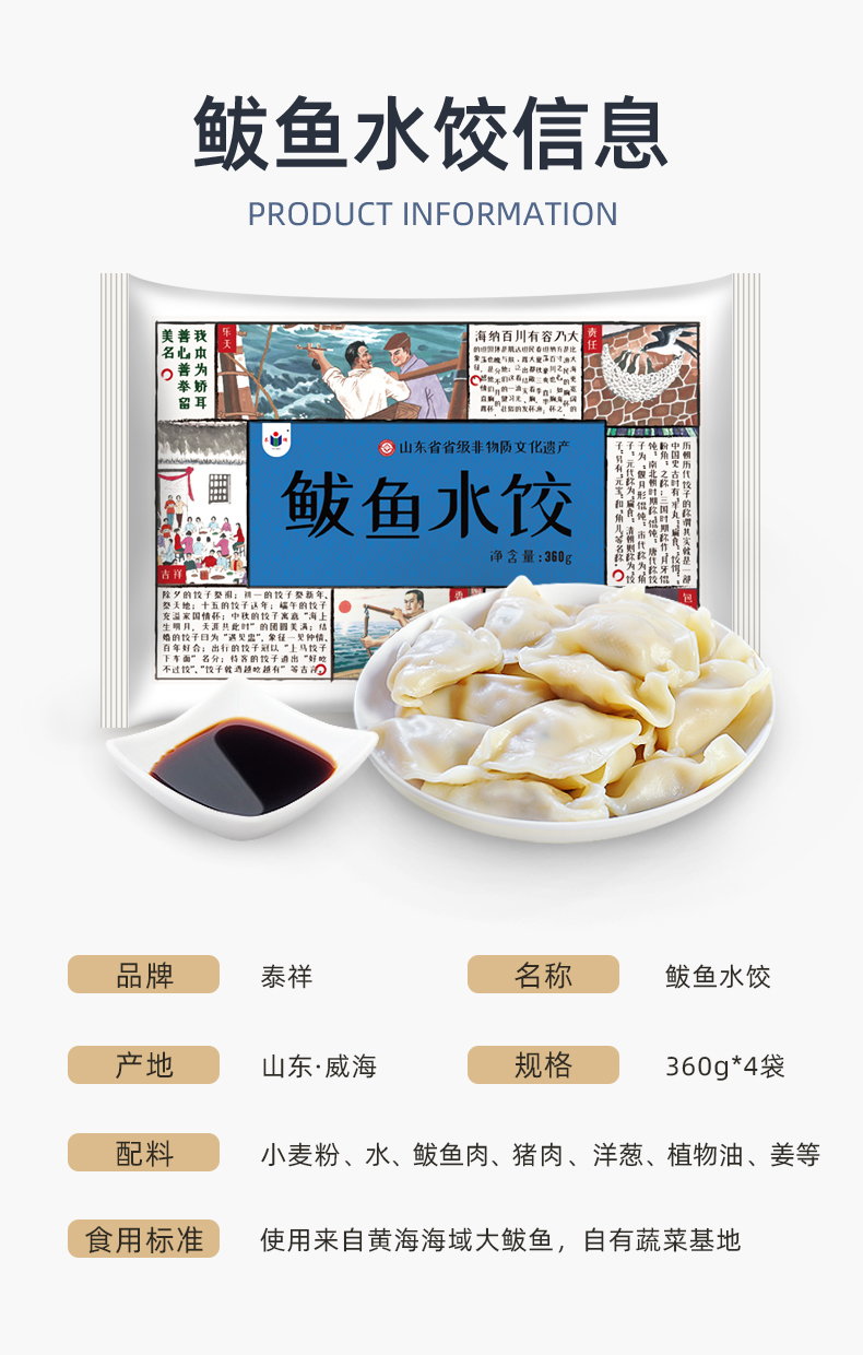 泰祥集团是一家以农副渔产品为原料进行精深加工的企业,拥有欧美出口水产品认证等体系认证。2004年“泰祥”商标被评为山东省著名商标、荣获AAA级信誉企业称号。并于2013年被选为“山东省非物质文化遗产”。目前,泰祥鲅鱼水饺现已出口到澳大利亚、荷兰、比利时、德国、英国、韩国等国家和地区。