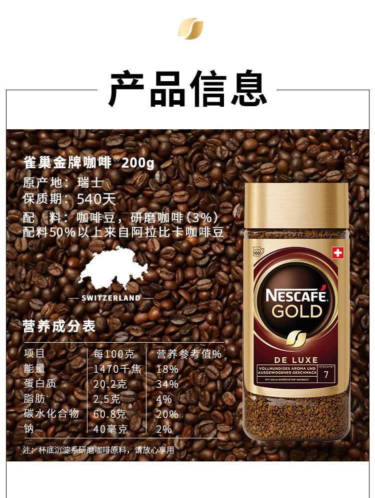 这款雀巢金牌黑咖啡,由瑞士原装进口,雀巢旗舰店发售,100%海外原装正品,盲测口感与现磨咖啡十分相近,不管是味道还是提神力都远超袋装速溶,而且不含植脂末和糖,非常健康。