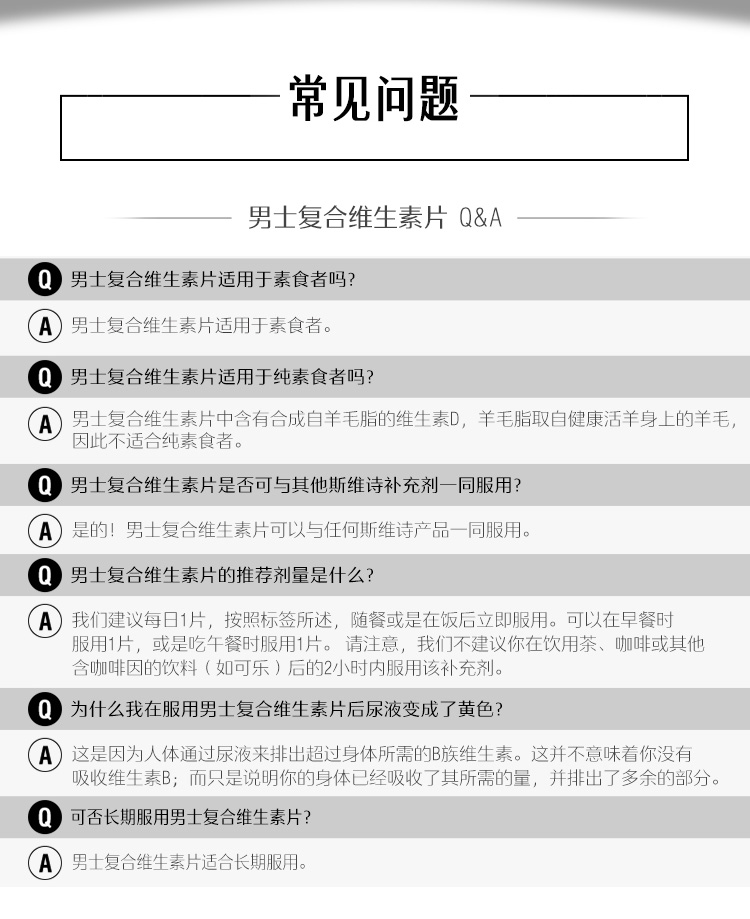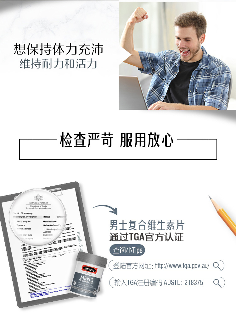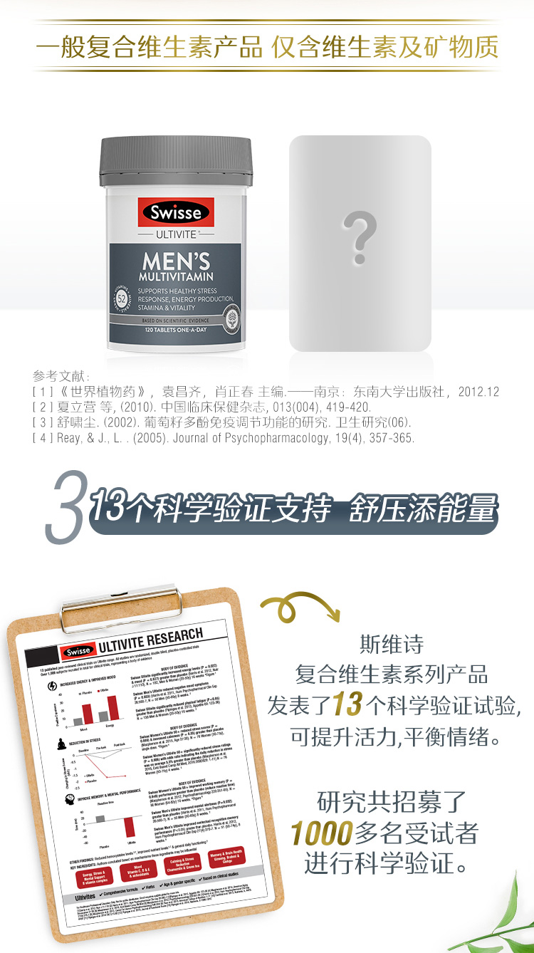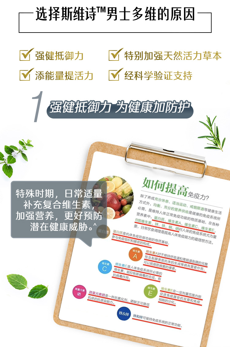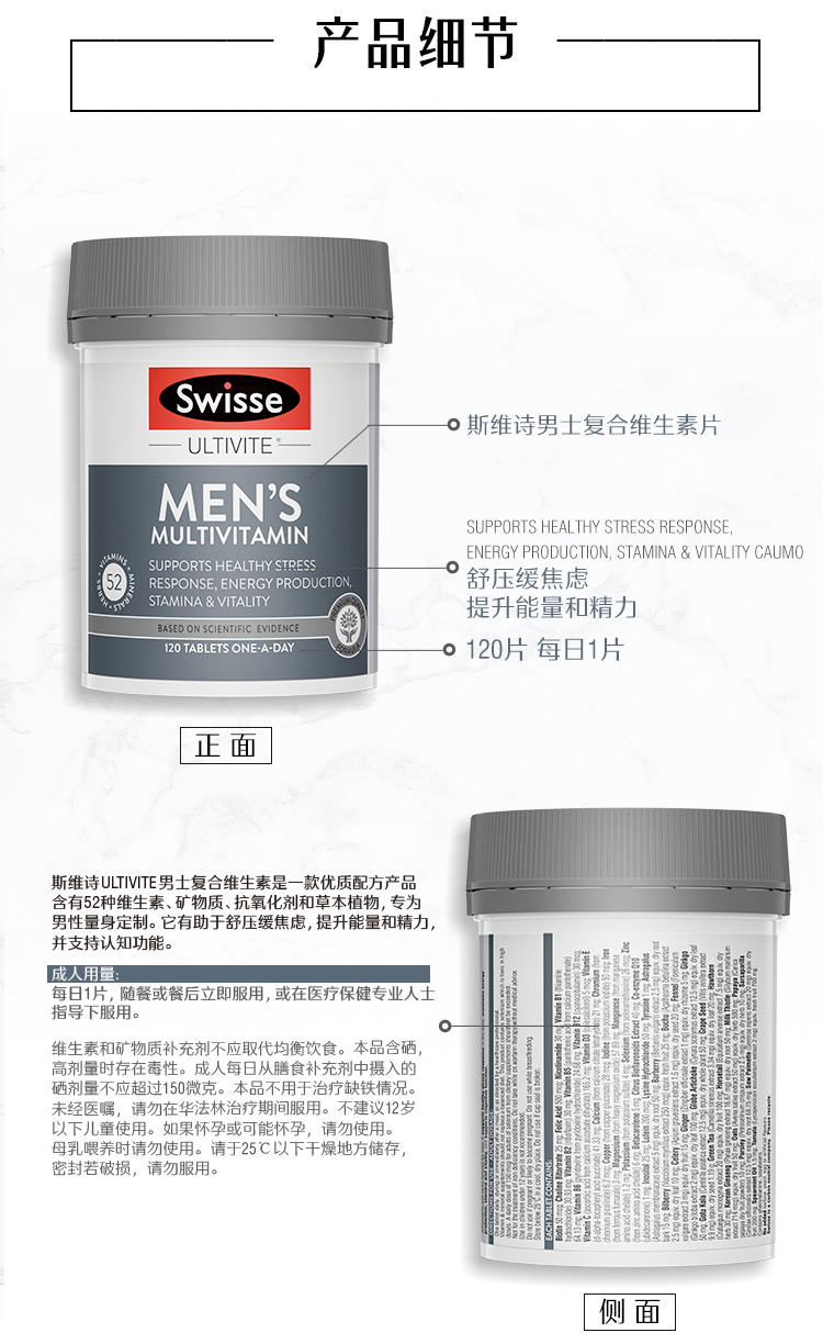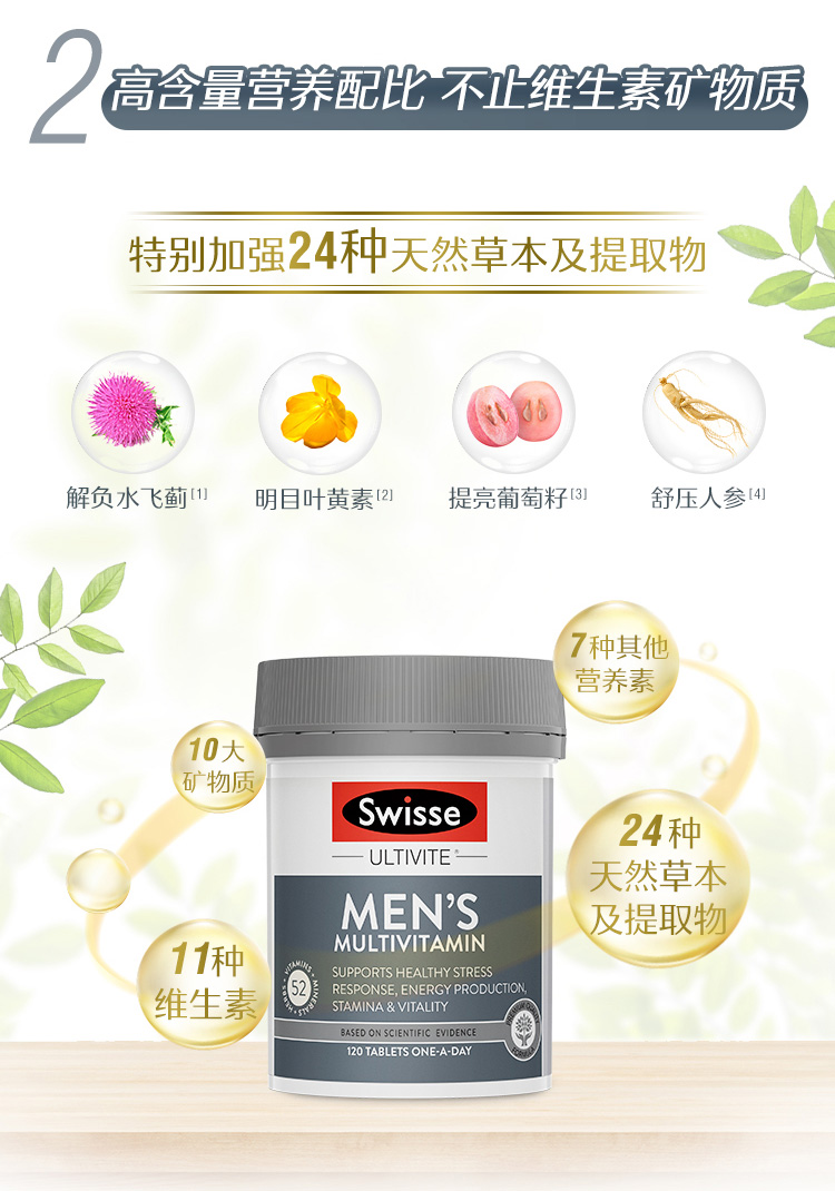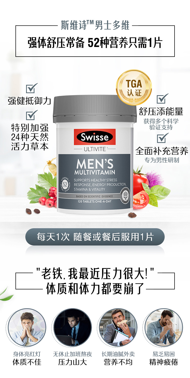 这款Swiss维生素片,专为男士定制,富含高达53种维生素,采用独特配方,营养均衡更丰富,不含防腐剂,食用安全健康。每日维生素,提升身体能量和耐力,增强免疫力,减压抗疲劳,为男人身体提供更好的能量支持。