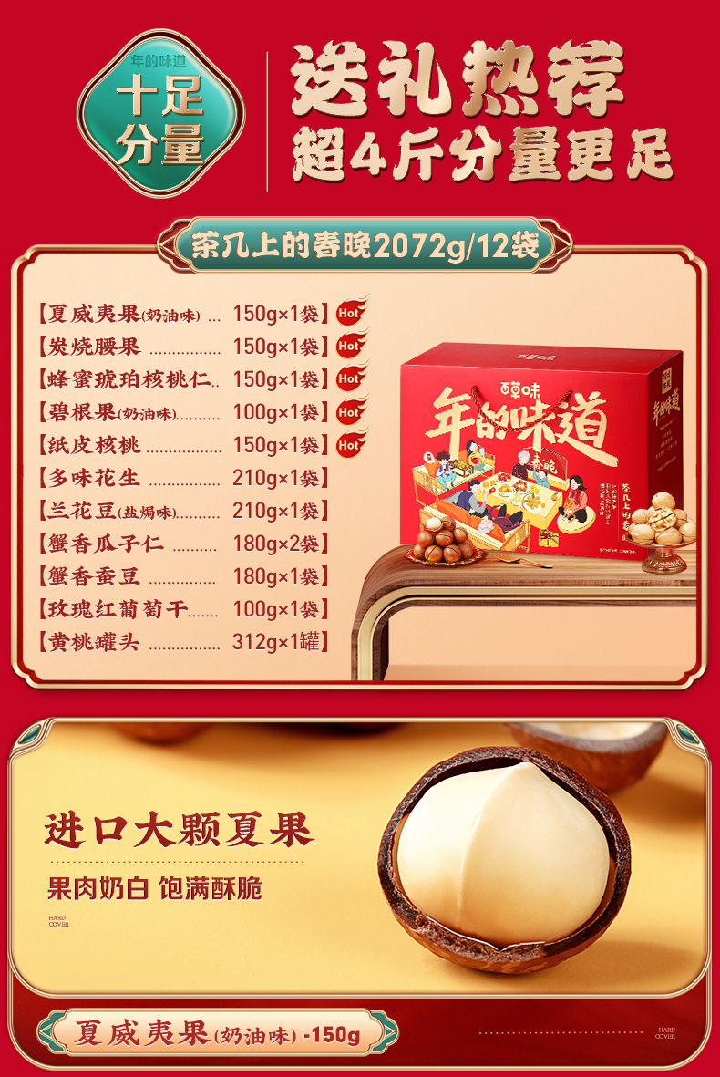 茶几上的春晚 12种零食,2072g包括:夏威夷果150g、碧根果150g、巴旦木150g、笑口板栗120g、炭烧腰果150g、兰花豆210g、螃香瓜子仁180g、黄桃罐头312g、玫瑰红葡萄干。