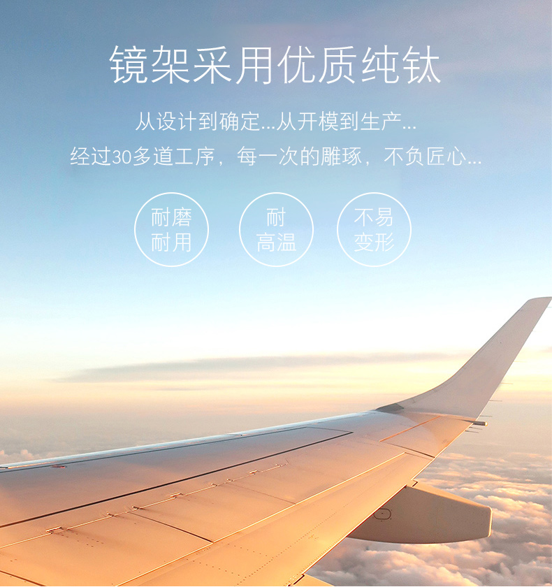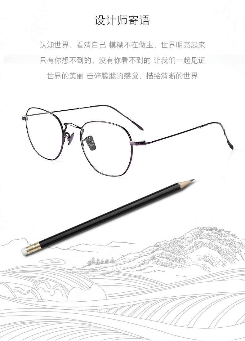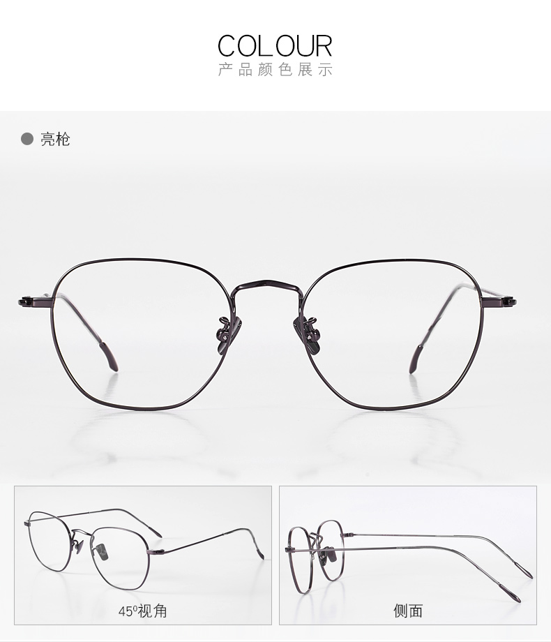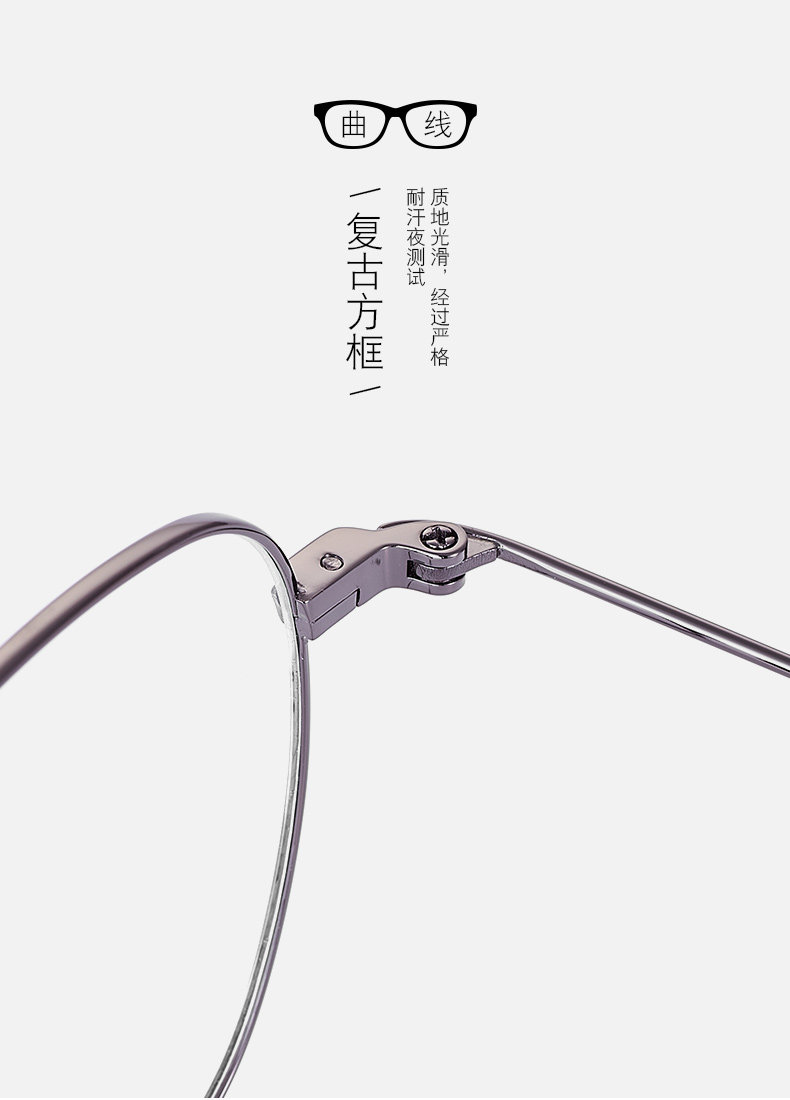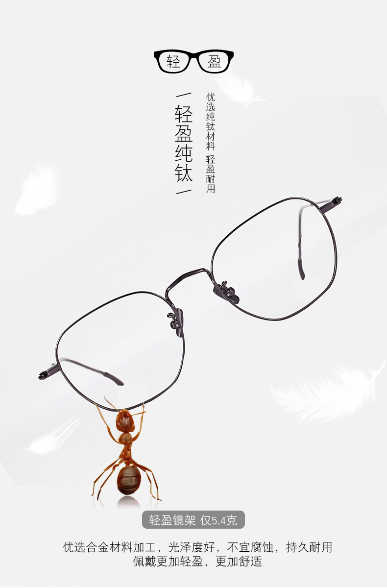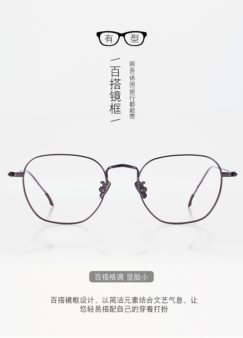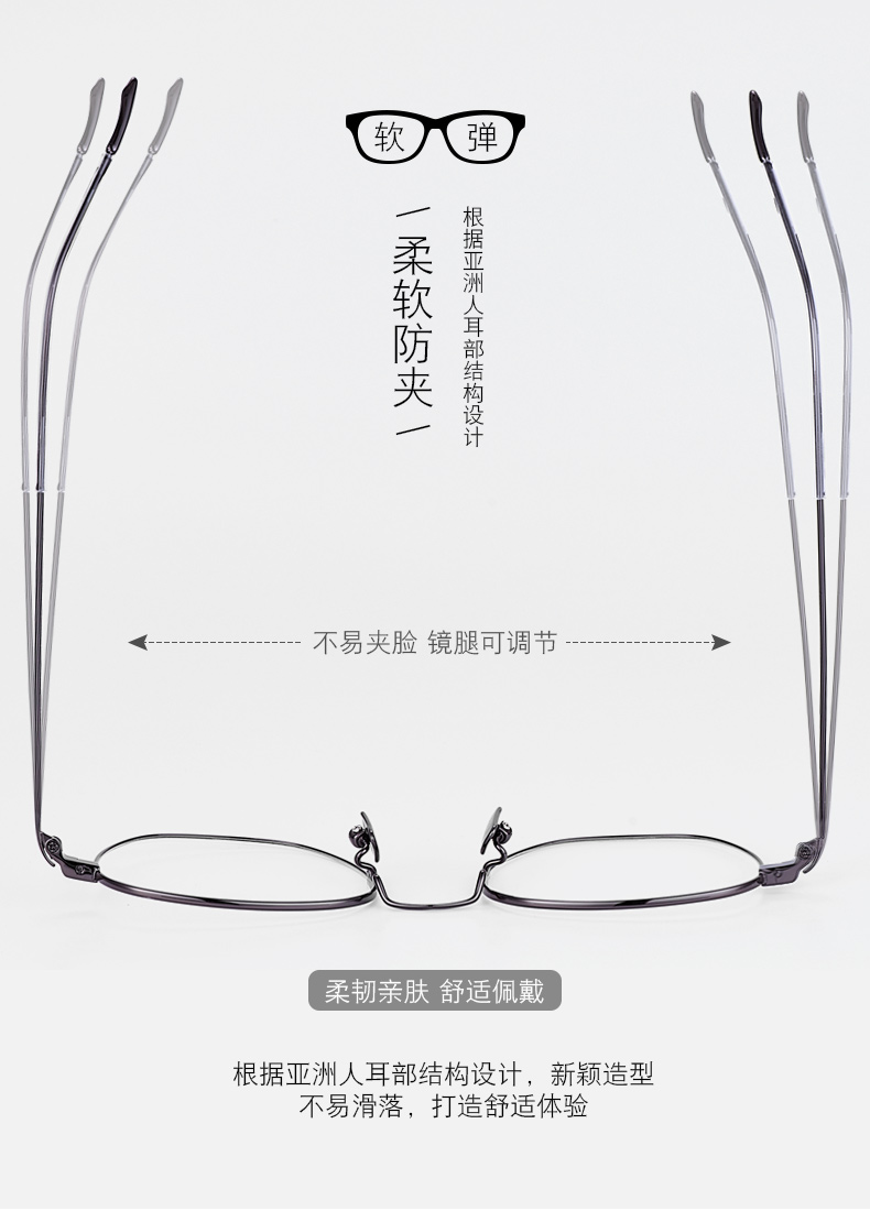 经典商务镜框,镜架材质为纯钛材质,耐腐蚀不生锈,不会引起皮肤过敏,眼镜仅重5.4克;舒适的外抛位弧形镜腿,保持着舒适的夹持力,减少头部压力;S型可调节鼻托杆,适合任何高度的鼻梁,镜腿处做了柔化处理,保证不摩擦皮肤。
