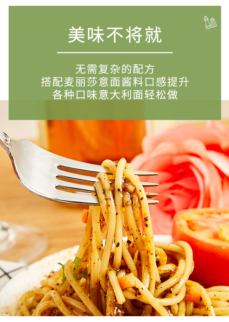 制作方面也很简单方便,无需复杂配方,只需煮熟搭配各种口味的意面酱,点缀一些水果蔬菜,一盘完美的意大利面便制作完成了。
