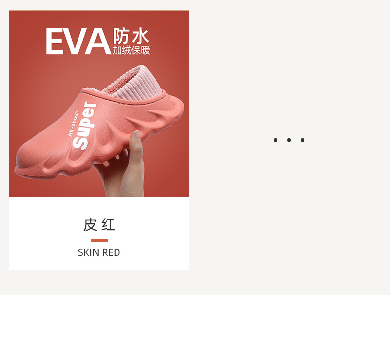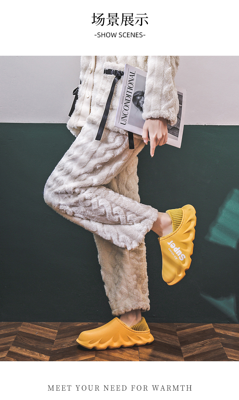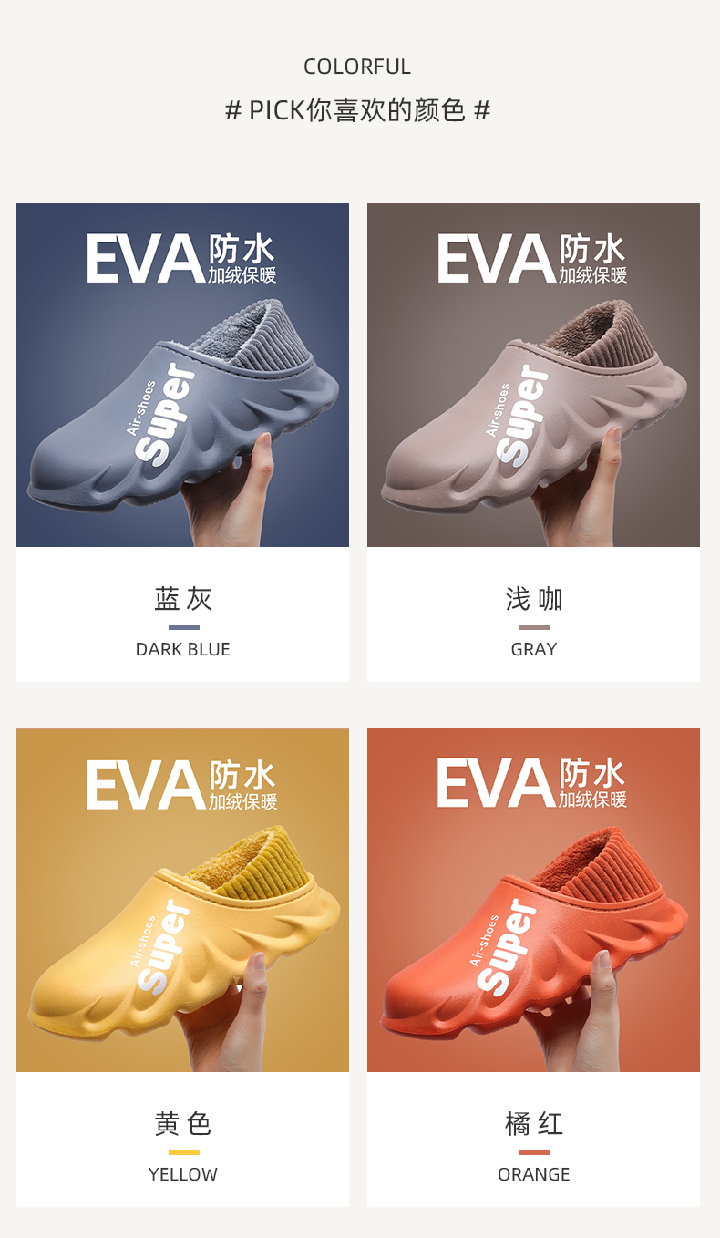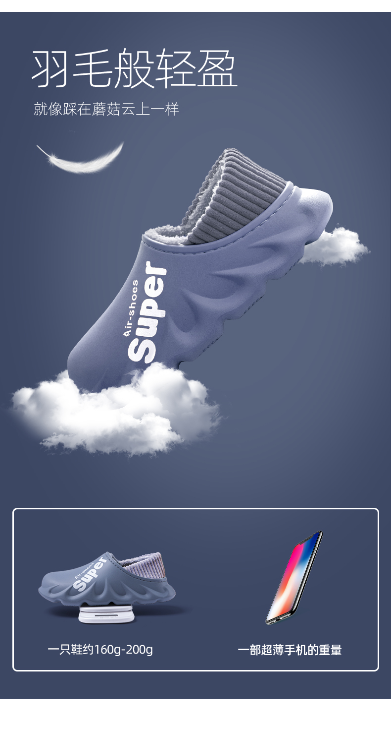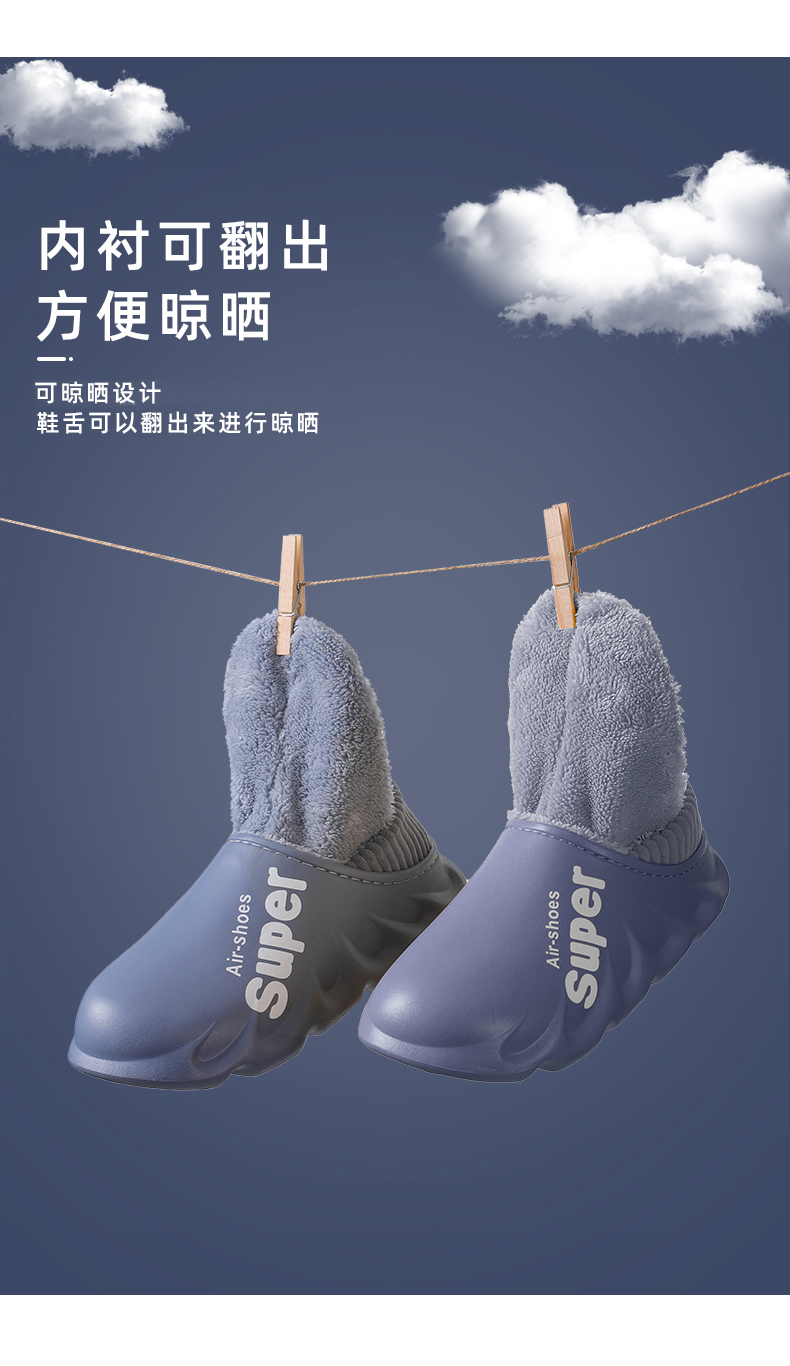 一体柔软轻质EVA材质,防尘防水,比手机还轻便,5CM加厚防滑鞋底,高密保暖法兰绒,针织罗纹脚口,久穿舒适不闷。法兰绒可翻出,清洗晾晒更方便。天