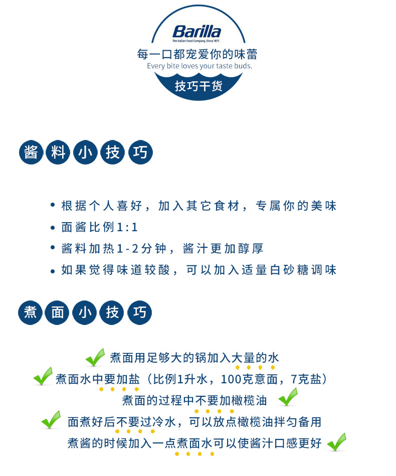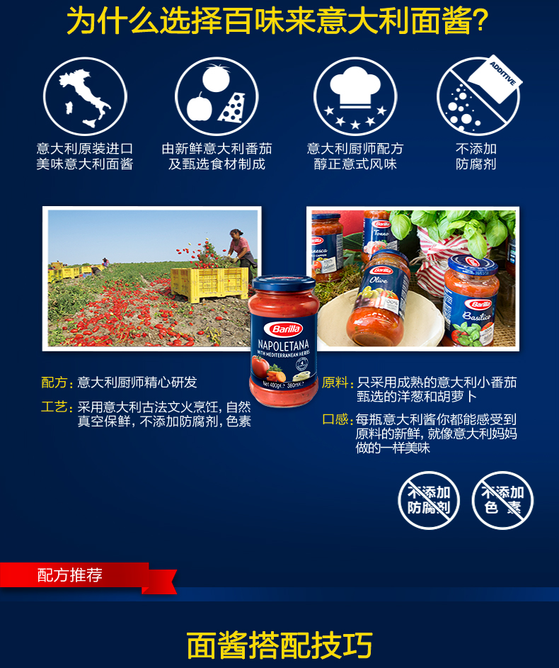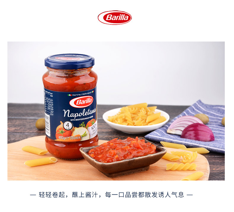 Barilla百味来是来自意大利的食品品牌,至今有着百年以上的历史,其拳头产品就是生产的意大利面类食品。这款番茄罗勒风味意大利面酱由美味番茄,芳香罗勒和各种精选当地食材混合制成,味道鲜爽芳香可搭配各类意面。