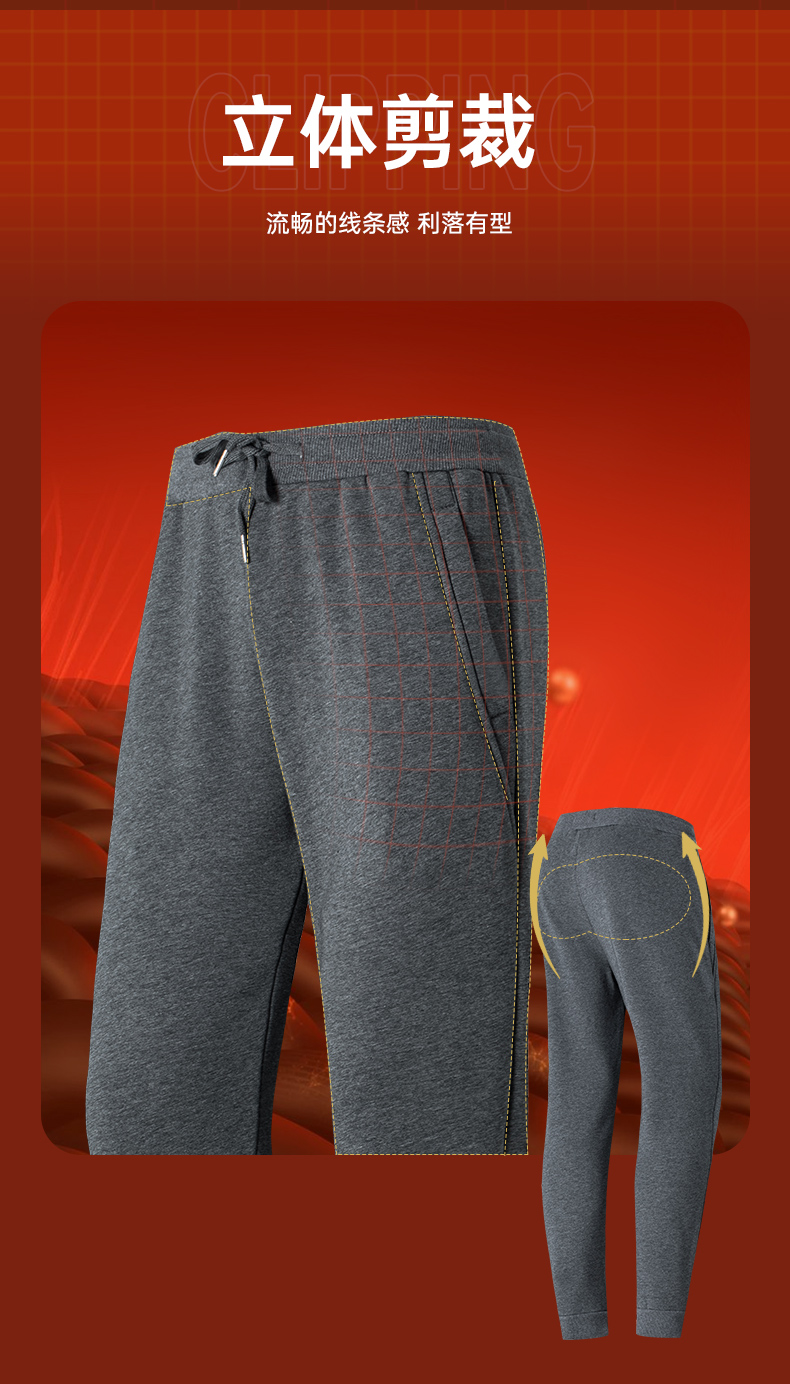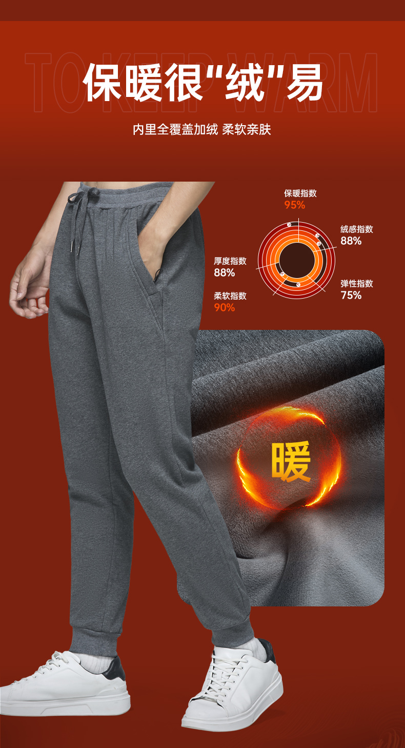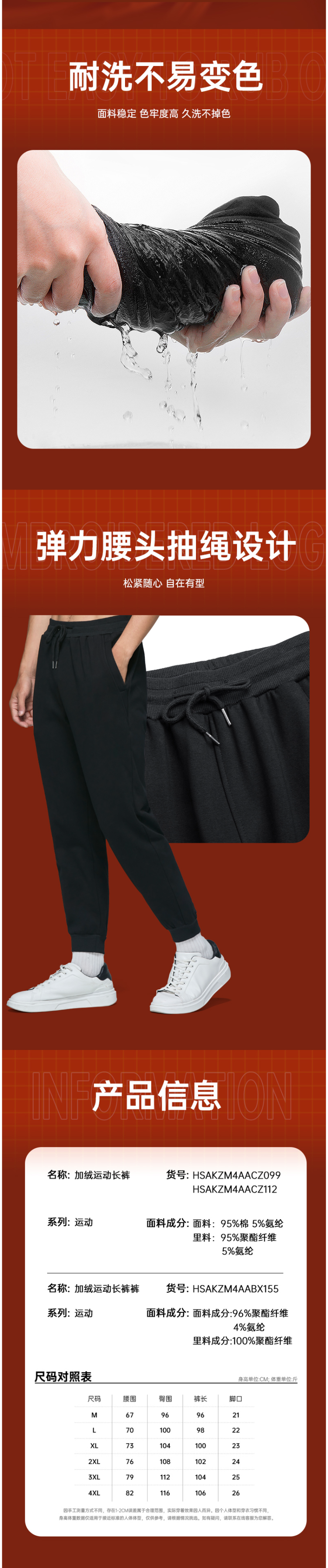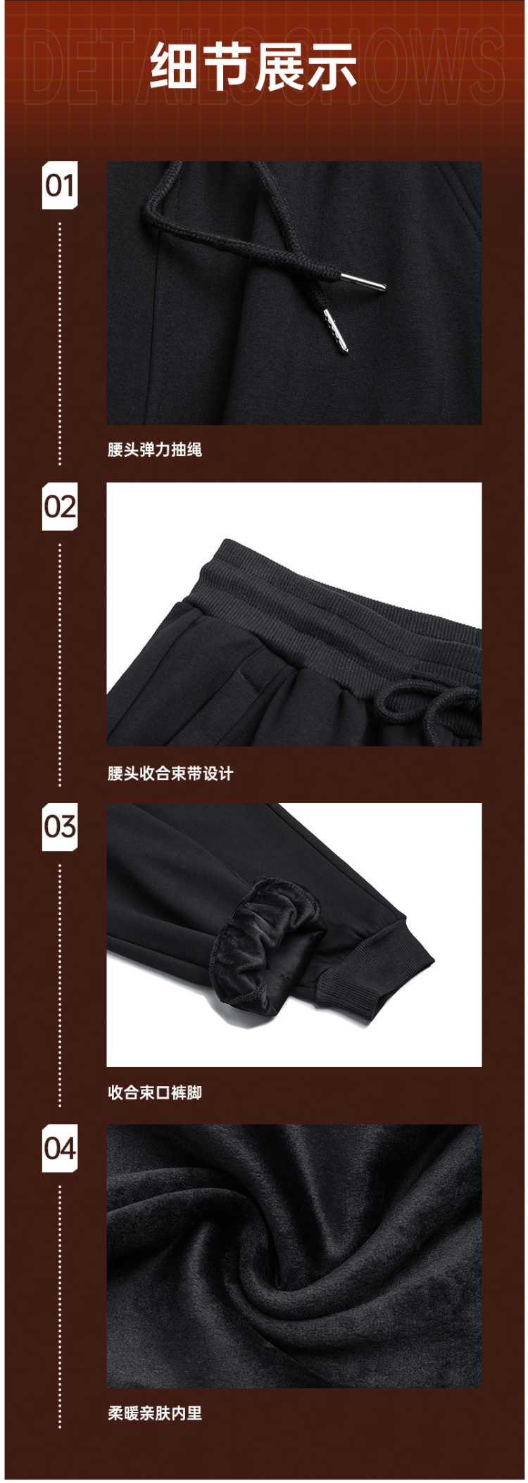 在款式上,标准版型,弹力松紧裤腰配抽绳,穿脱方便;弹力收束裤脚,避免冷风倒灌,裤脚走线平整流畅。裤子还特别经过抗静电处理,避免秋冬季的静电和吸附灰尘。