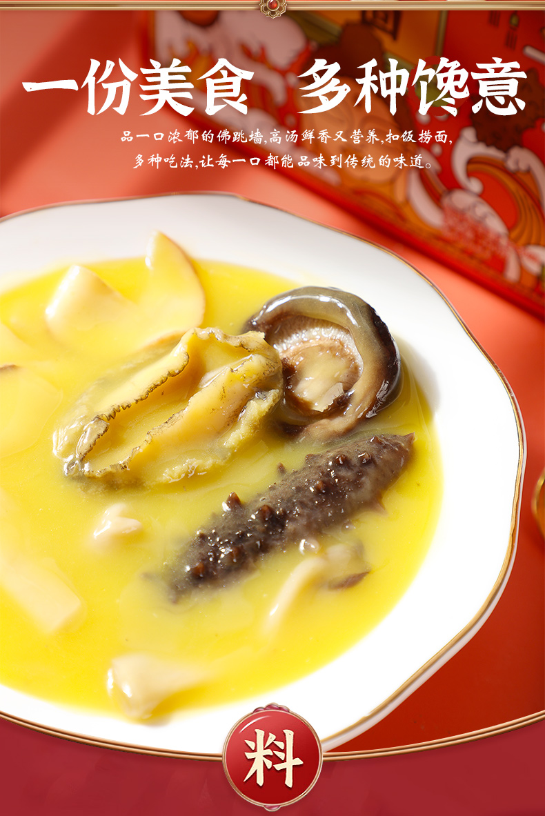这款绝世 加热即食佛跳墙250克装,食材包括海参、鲍鱼、杏鲍菇、花胶、香菇、螺肉、蹄筋和干贝,高汤熬制12小时,鲜香浓郁,肉质紧实,参体爽滑,胶质饱满,口感黏腻,鲜香扑鼻,细嫩鲜美,加热即食,回甘不燥,浓郁不腻。