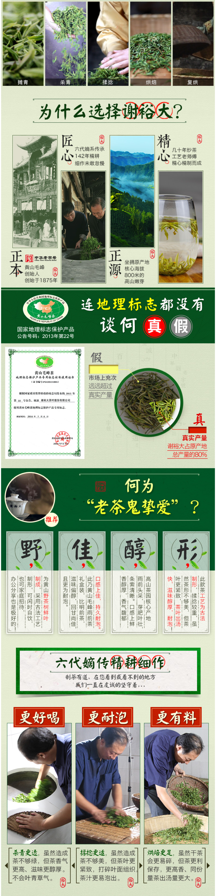 谢裕大茶庄前身为创办于1875年(光绪元年)的“谢裕大茶行”,缔造者谢正安,晚清制茶专家,因其创制的“黄山毛峰”,而被载入史册,“谢裕大茶行”因此名声鹊起,成为上海滩首屈一指的大商号,为中华老字号茶行之翘首!2010年,谢裕大茶行成功改制为黄山谢裕大茶叶股份有限公司,公司产品中黄山毛峰和太平猴魁为“国家地理标志保护产品”。公司实际控制人、董事长谢一平先生既是省级非物质文化遗产项目“绿茶制作技术”代表性传承人,也是黄山毛峰创制者谢正安的第五代嫡系制茶技艺传承人。2010年,获国家商务部“中华老字号”认定。