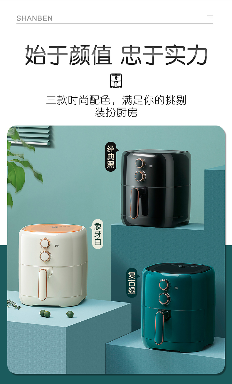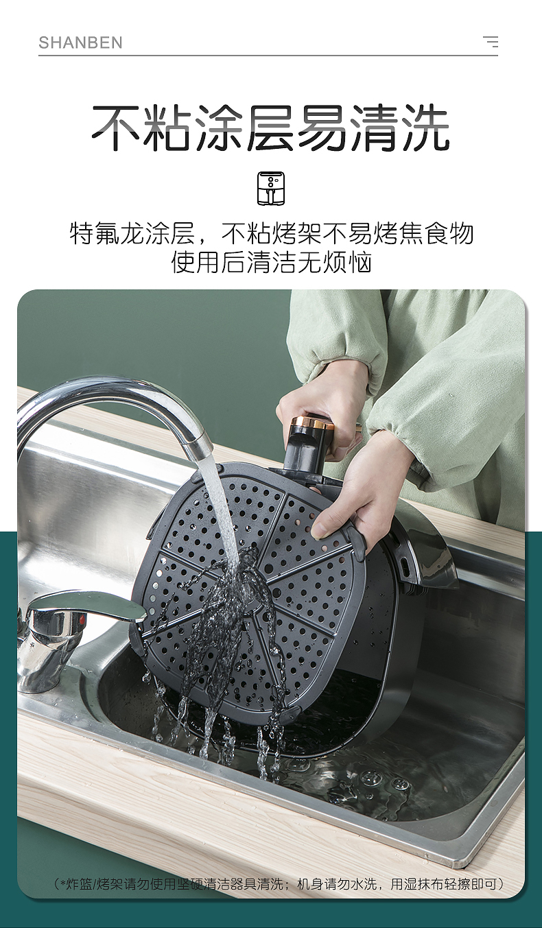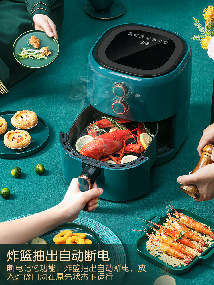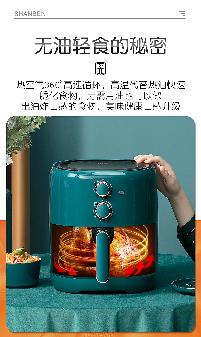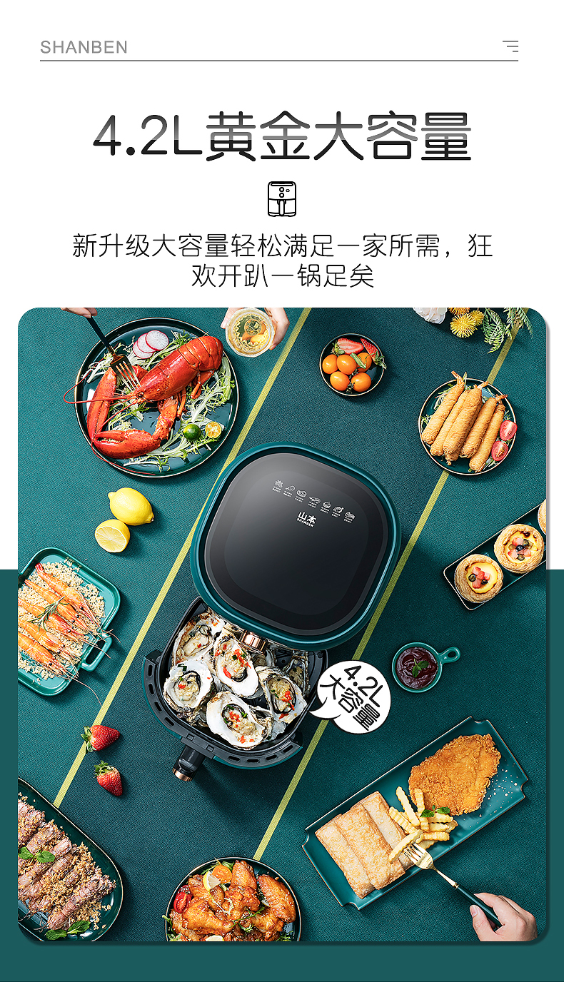 这款是升级第五代,容量4.2L,可无油煎炸、烘焙、烧烤等,功能齐全,同时无油更健康。采用高速空气循环技术,利用食物本身的油脂,360度气体加热渗透,轻松烹饪健康美食;智能操作,可调节温度和时间,一体式导风槽内胆,外层采用不粘锅涂层,清洗方便,经久耐用。