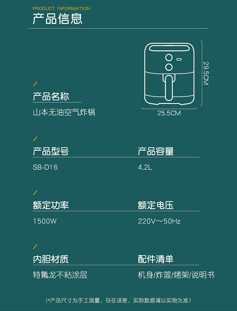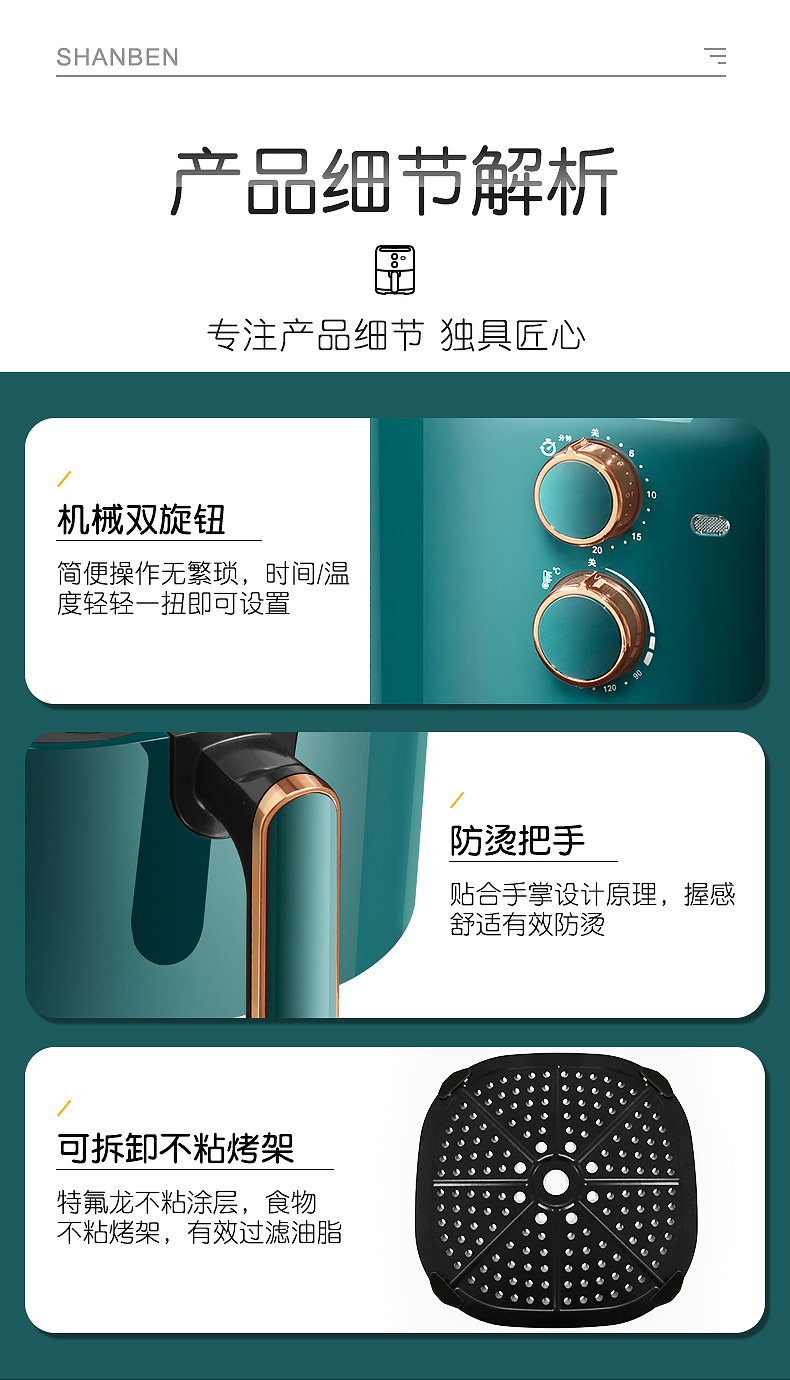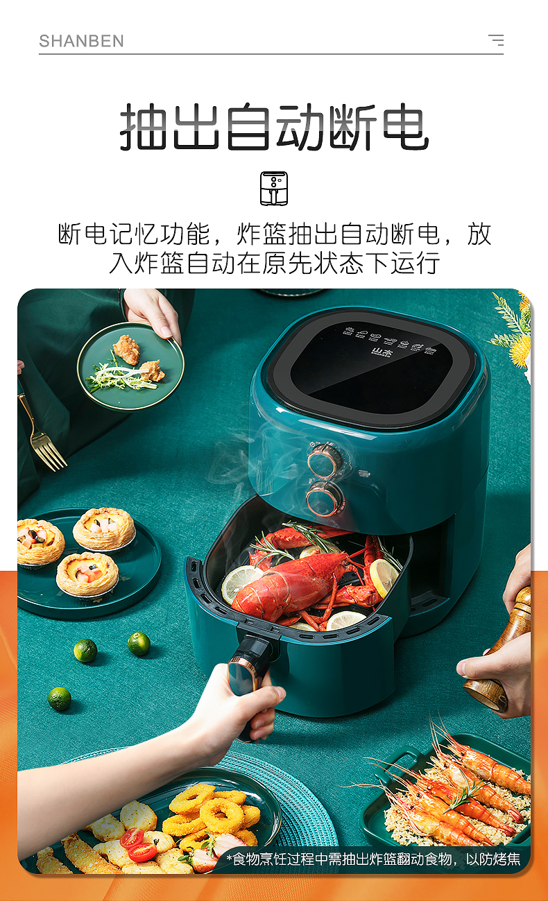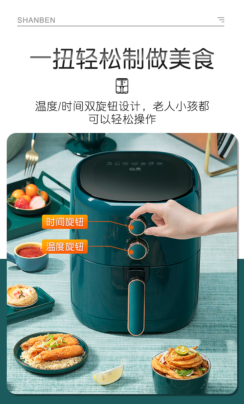 这款是升级第五代,容量4.2L,可无油煎炸、烘焙、烧烤等,功能齐全,同时无油更健康。采用高速空气循环技术,利用食物本身的油脂,360度气体加热渗透,轻松烹饪健康美食;智能操作,可调节温度和时间,一体式导风槽内胆,外层采用不粘锅涂层,清洗方便,经久耐用。