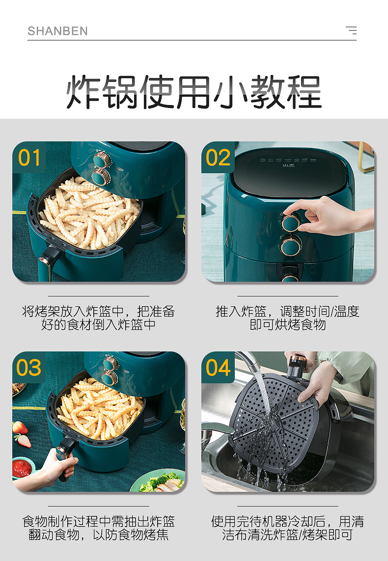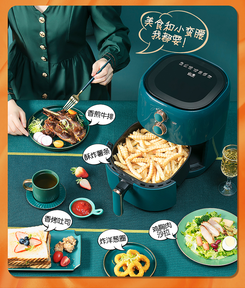 空气炸锅其原理和烤箱类似,通过高速热空气循环,利用食物自身的油脂炸熟食材,相对比传统的油炸更健康,口味也和烧烤的差不多,味道不错。相比烤箱的大体积,空气炸锅更省空间,适合三口之家日常使用,比较实用。