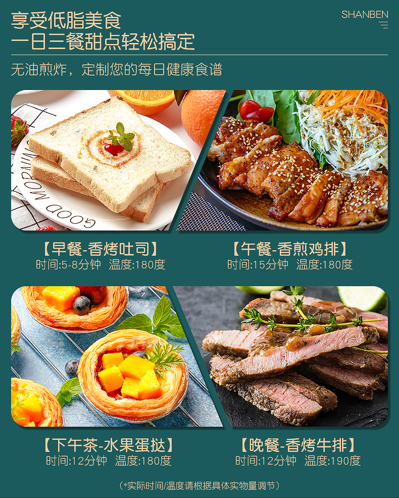 空气炸锅适合烹饪各种肉类、薯条、蛋挞(某宝上可直接买坯子 蛋液)。也可加热买来的外卖熟食,如 披萨、香肠、猪蹄、面包片类之类的,还是很方便的,也是厨房中实用比较高的厨具。