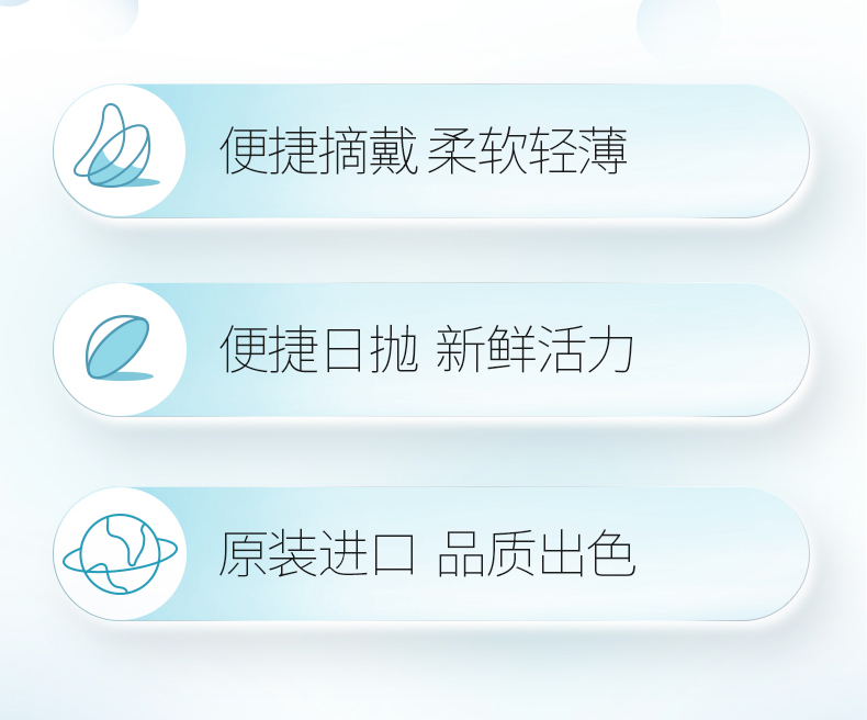 低镜片设计,减少眨眼间与镜片的摩擦,有效降低异物感,增加瞬目的舒适度;镜片边缘采用干式膜铸工艺,使表面更加光滑,成形性好,更易于操作,对初期佩戴者尤其方便。