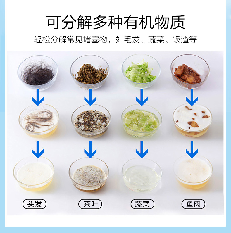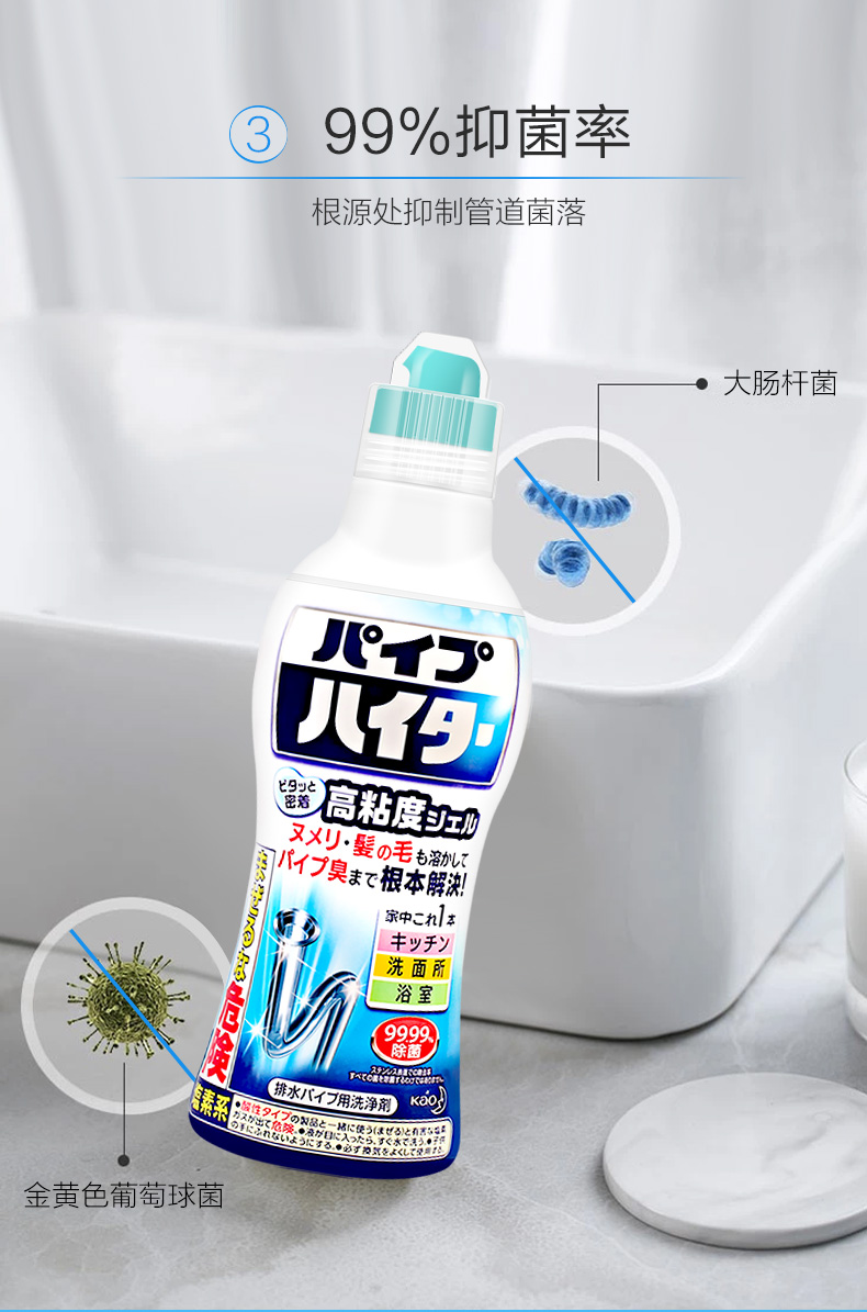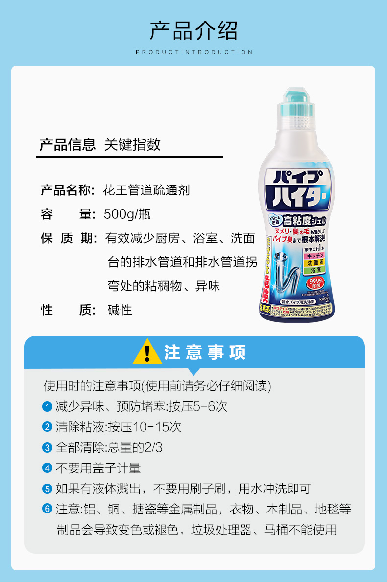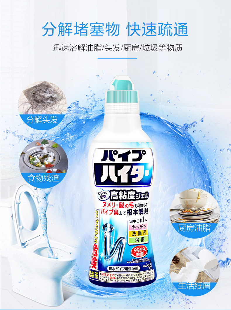 日本原装进口 花王强力疏通堵塞,一瓶搞定。可迅速分解多种有机物,如油脂、毛发、蔬菜、水果、肉类、等食物残渣,同时除菌除异味,根源处抑制管道菌落,不伤下水管道。适用塑胶、陶瓷、铸铁、PVC、PE等管道。