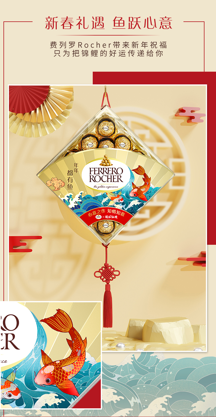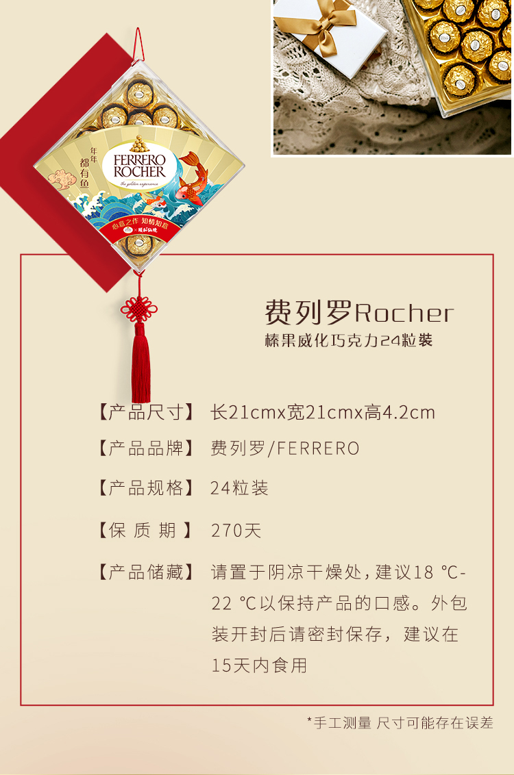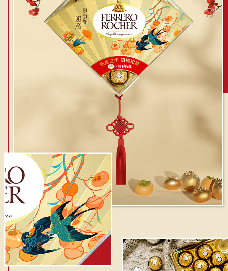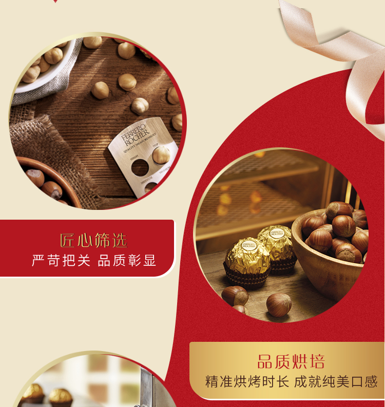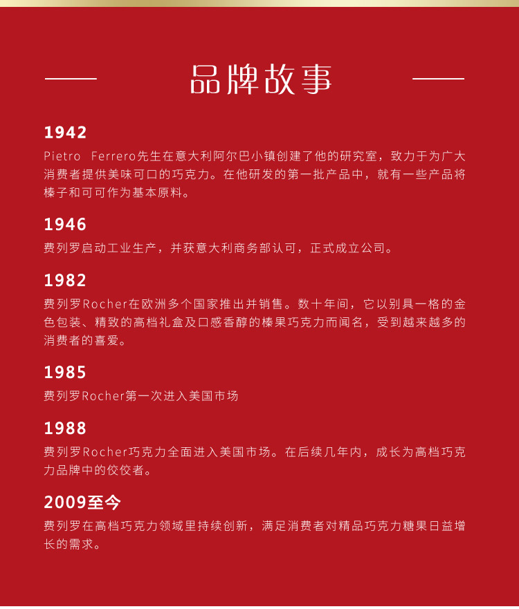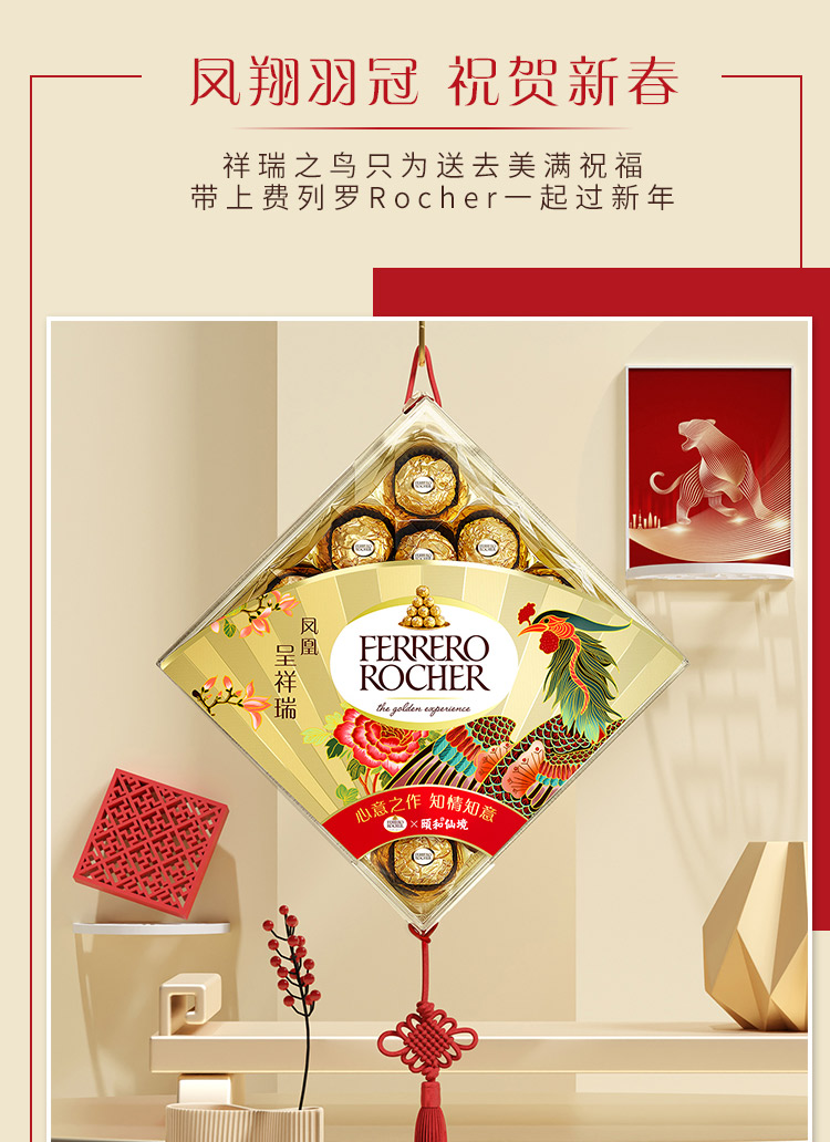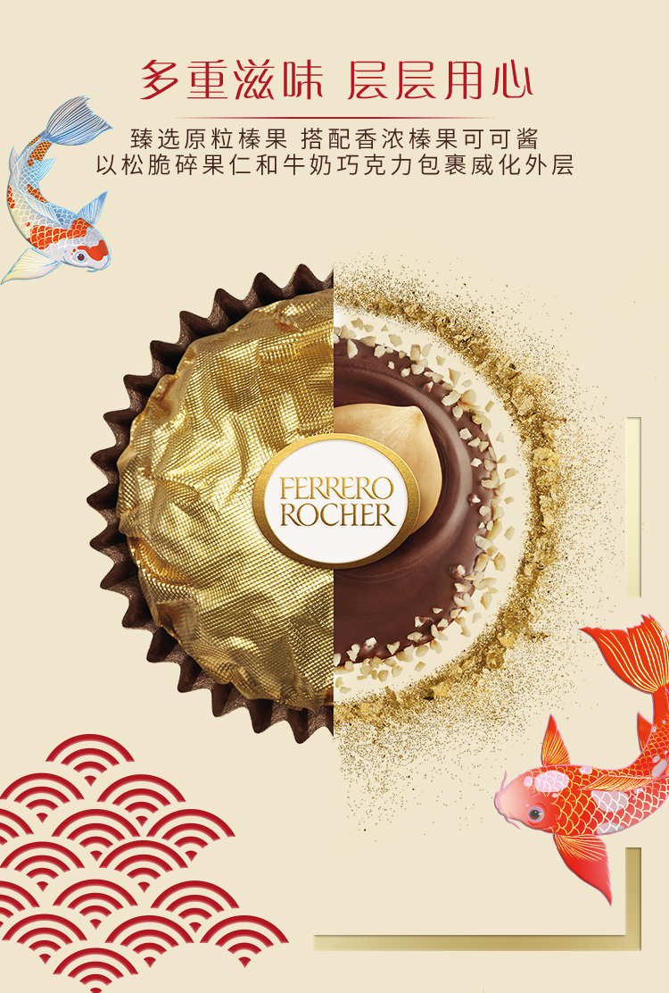 费列罗Rocher是国人比较热衷的巧克力产品。原创配方、精心制作、雅致包装和开创性的推广活动;新颖的形状 – 圆形却不规则 – 与金箔纸独立包装,让其尽显典雅华贵;独特风味呼之欲出:外层香浓巧克力,内有松脆威化及香滑榛果可可酱和原粒榛果,带来多种口感的享受。