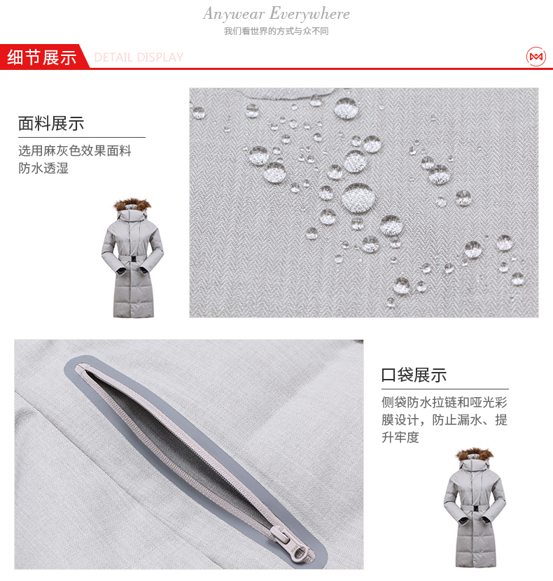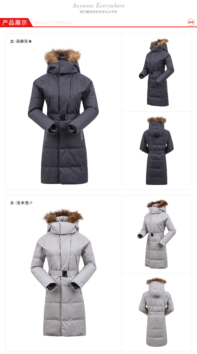 这款羽绒服是地球科学家2017年的高端款,修身收腰立体版型,下摆长度接近膝盖,女生上身效果非常好。在外层面料上,使用防水透湿耐磨的冲锋衣面料,近乎100%防雨、100%防风,还拥有良好的透气性,增强了防护效果,冷风不易吹透。