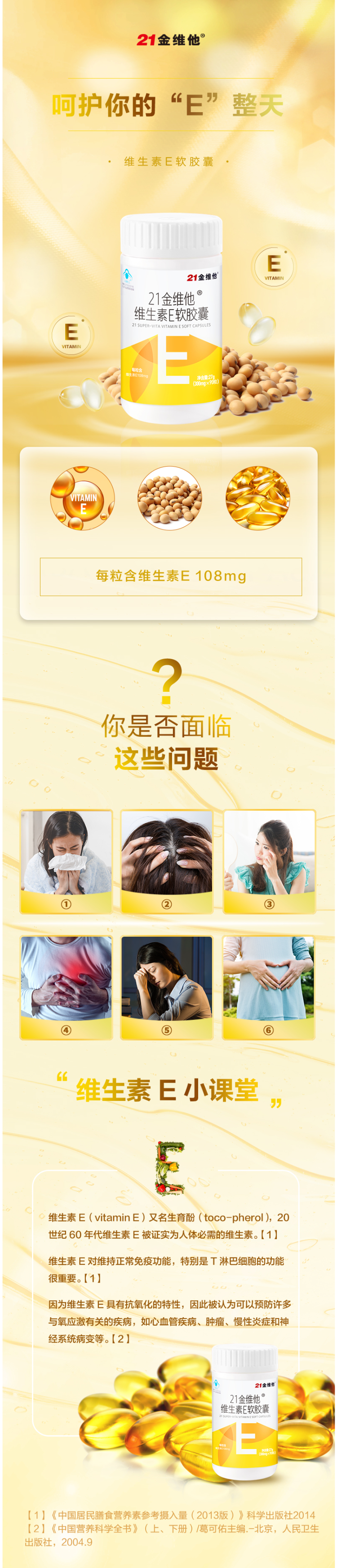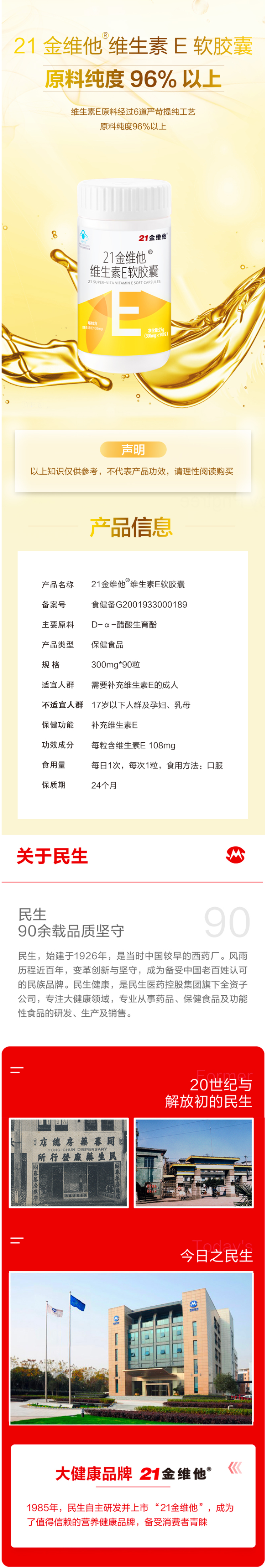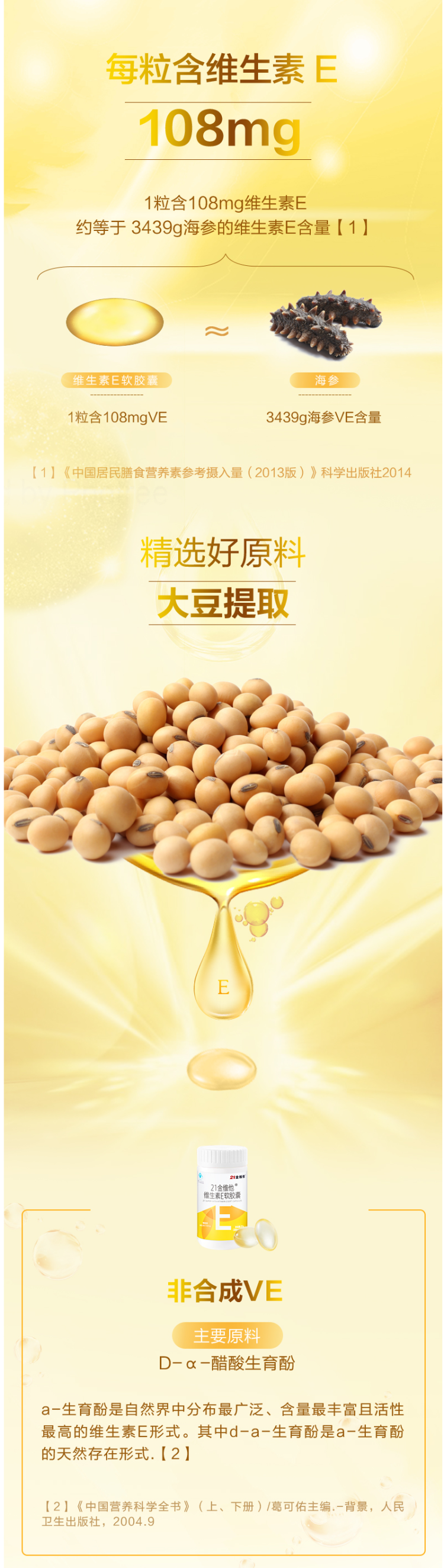 这款21金维他 维生素E软胶囊,从优质大豆中提取,纯度达到96%,每粒含108mg维生素E。