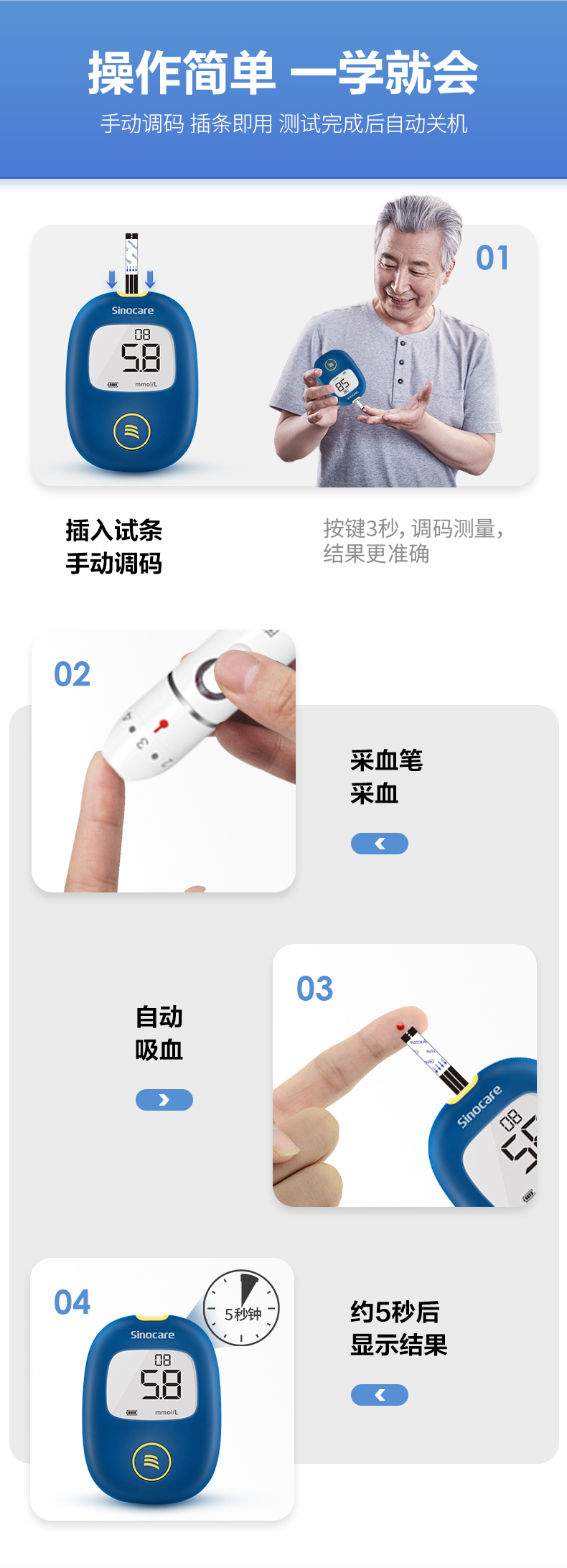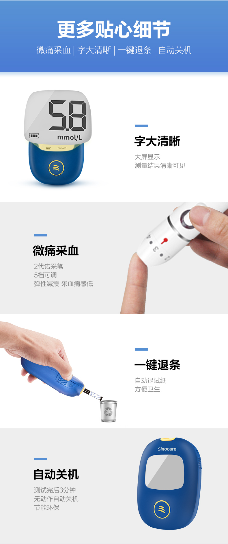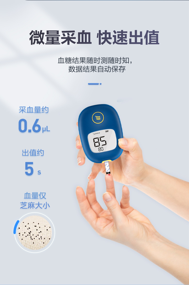 这款三诺血糖仪,配试纸50片+采血针+酒精棉片50枚,采用新型SOC测量芯片,能快速分析血液样本,急速测量5s出结果,无需等待;插条自动开机,智能免调码,无需手动设置,可明显减少测量误差,一键轻松退条。全程语音播报,使用轻松方便。
