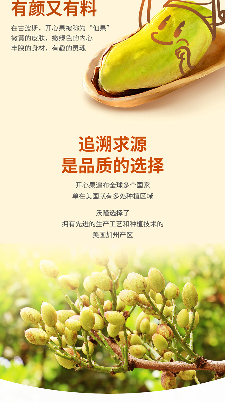 这款沃隆 原味无漂白开心果,原果来自美国加州,果实自然成熟开口,果肉饱满、大小均匀、经典原味,酥脆微软,没有经过漂白,可健康食用。