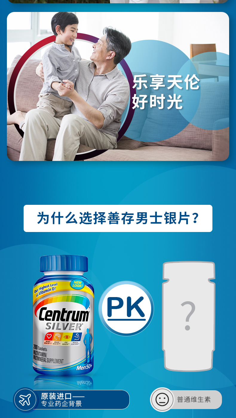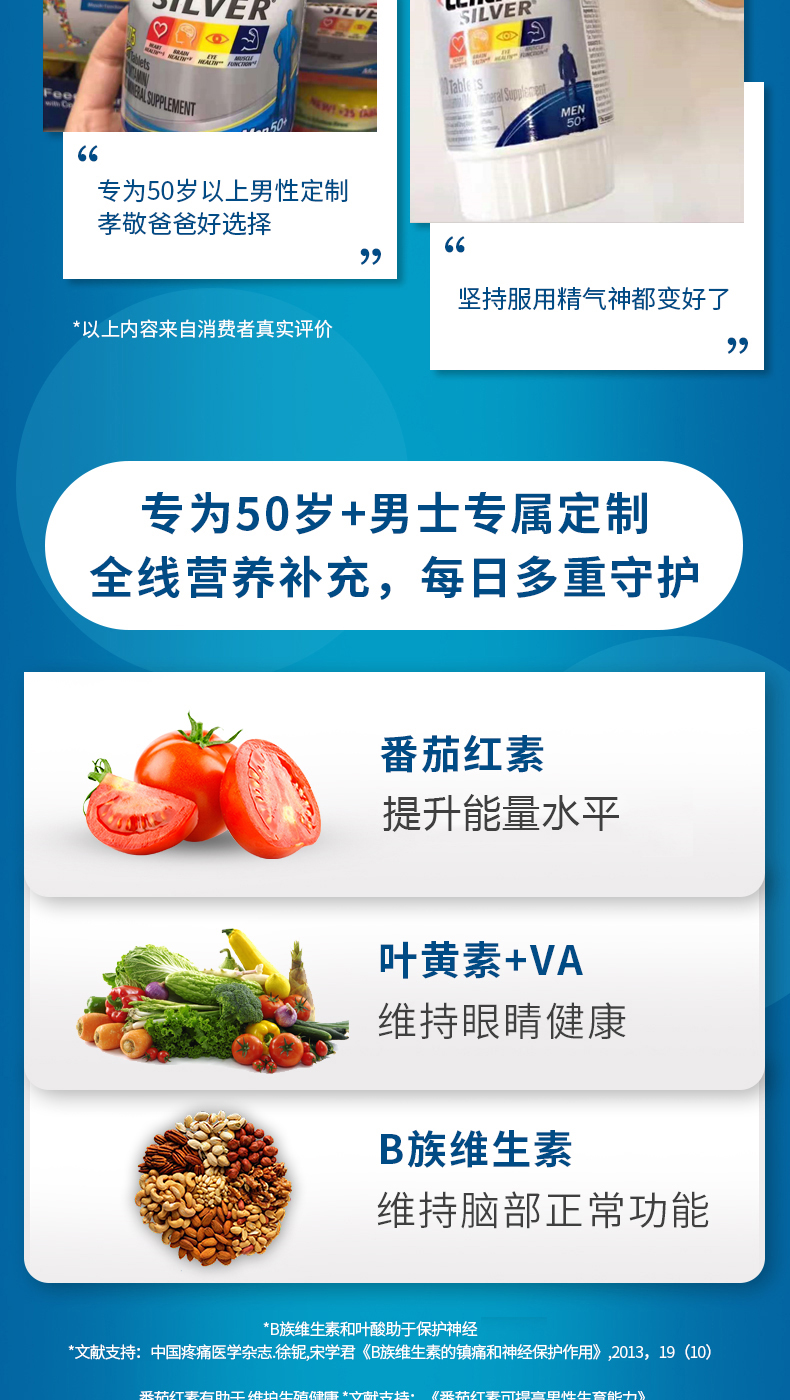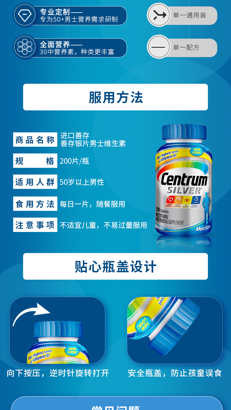 这款善存银片专为50岁以上的中老年男士设计,复合27种营养,5大维生素、8种B族、12种矿物质维生素,特别添加了番茄红素和叶黄素配比,可补充日常所需营养,提高免疫力,每日1片,随餐服用。