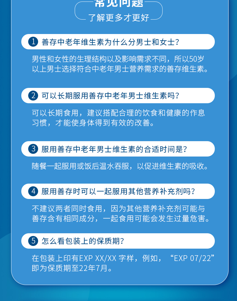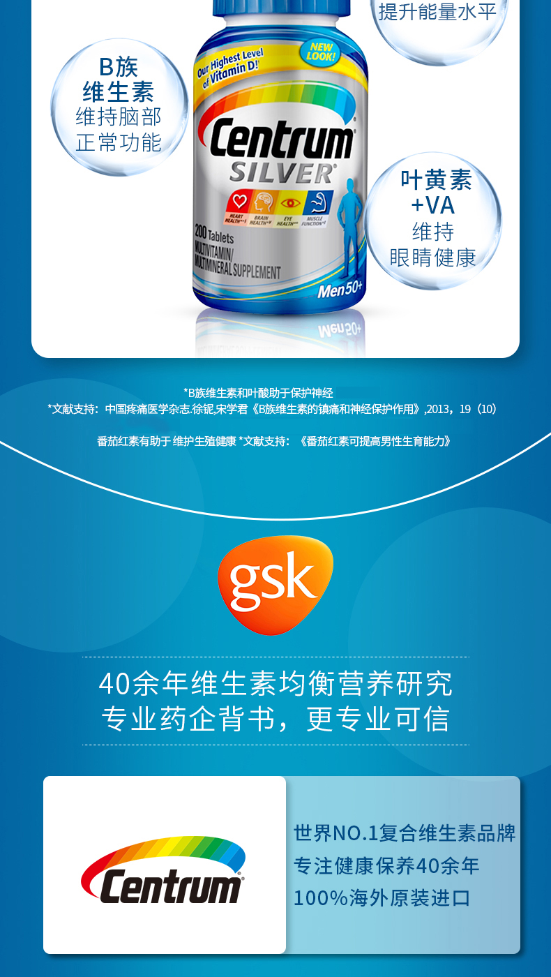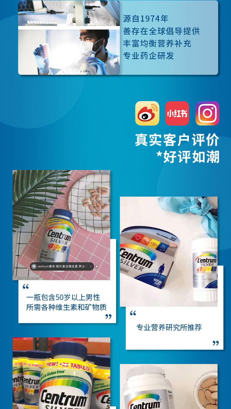 这款善存银片专为50岁以上的中老年男士设计,复合27种营养,5大维生素、8种B族、12种矿物质维生素,特别添加了番茄红素和叶黄素配比,可补充日常所需营养,提高免疫力,每日1片,随餐服用。