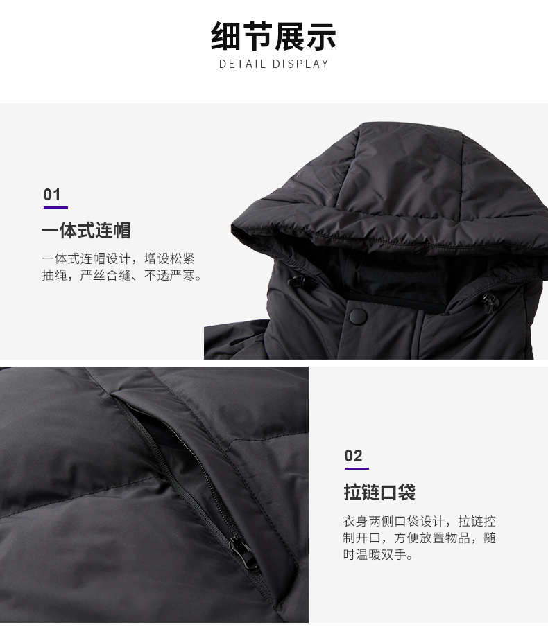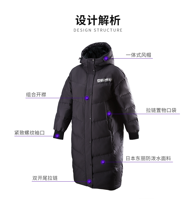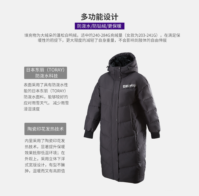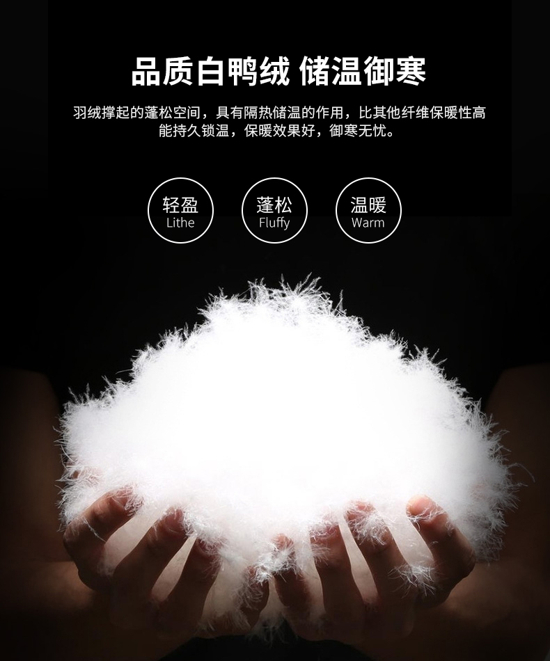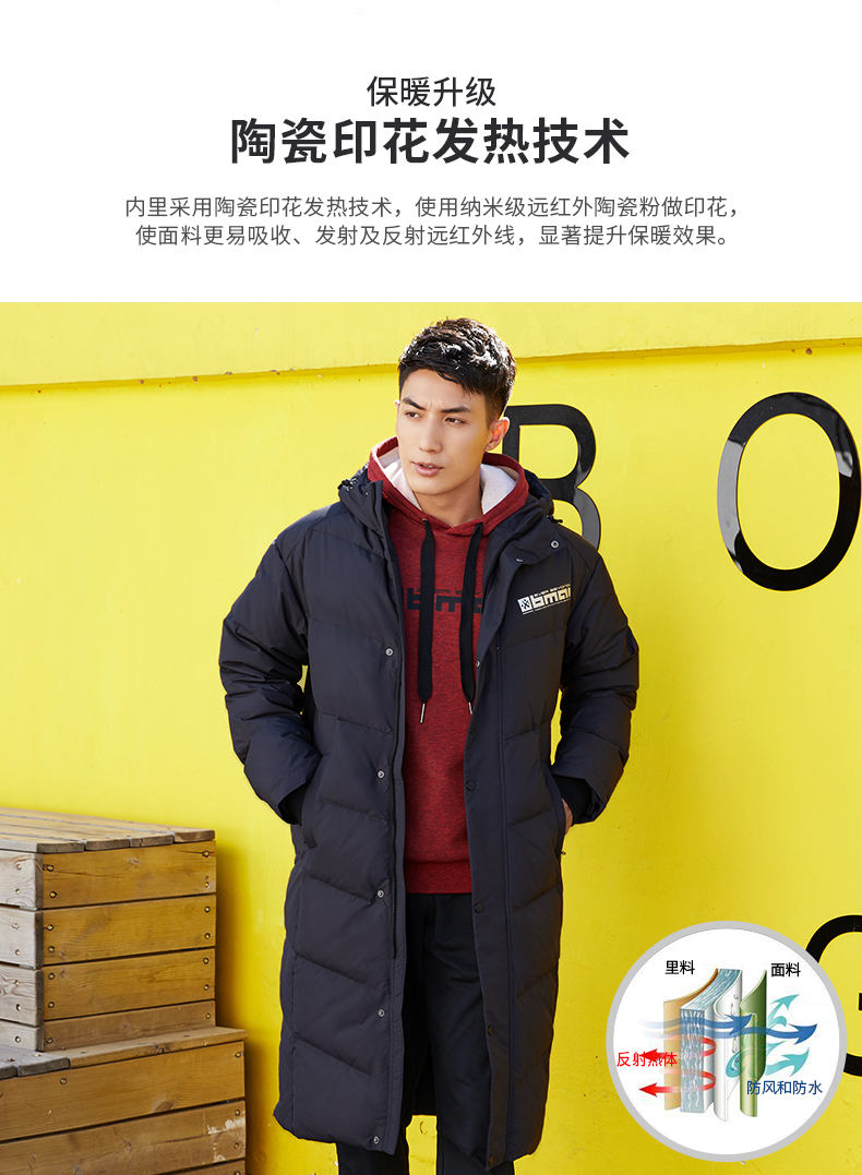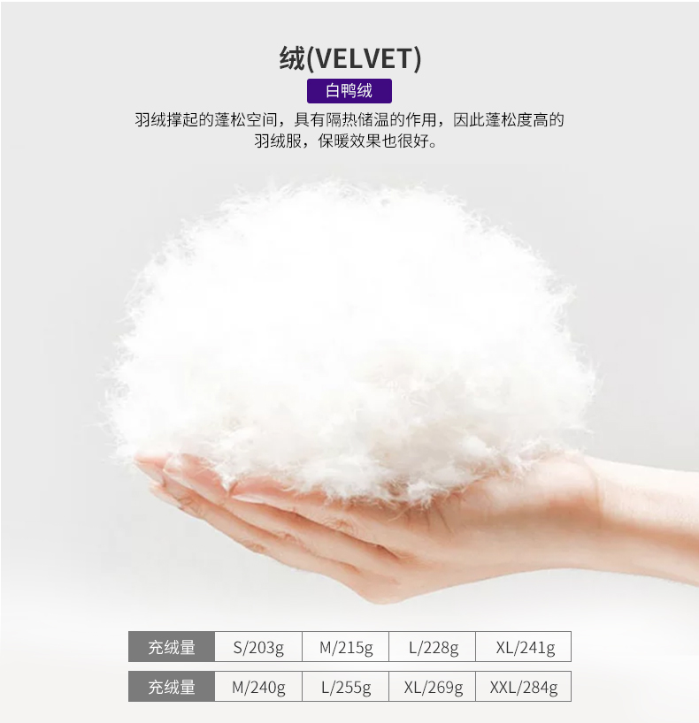 内里填充的是200-250g的鸭绒,从充绒量上来说是加厚重装款,能抗零下10度的寒冷。同时还运用陶瓷印花发热技术,用纳米级远红外陶瓷粉做印花,使面料更易吸收、发射及反射远红外线,显著提升保暖效果。