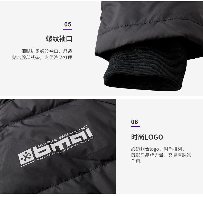 双层袖口:高端羽绒服,会使用两层防风袖口。在衣袖里增加一层弹力松紧袖口,可里外伸缩,完全不会从袖口进风。袖口容易脏,伸缩袖口脏了随便洗,避免多次洗衣造成保暖下降。