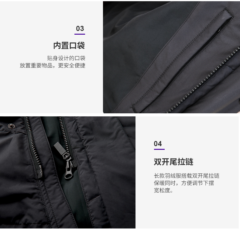 主门襟是上下双开拉链,热的话上下都可拉开。拉开下摆坐下后不窝囊,避免把衣服堆的皱皱巴巴。在寒冷的室外,也方便从裤兜拿东西,或做一些不方便做的事。