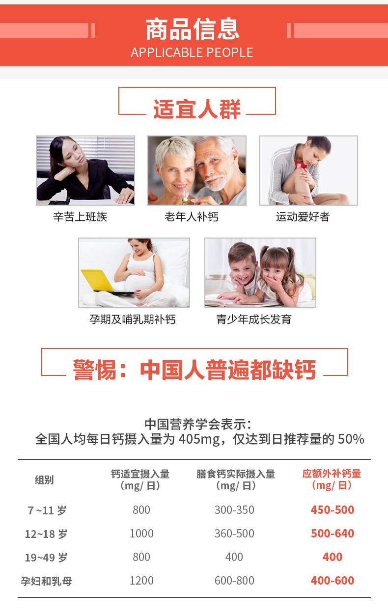 这款钙片含有天然钙和维他命D3,维他命D3协助钙质吸收。能够防治骨质疏松、骨折、腰酸背痛、抽筋、驼背、高血压、失眠、痛经、情绪不稳定等症状,调节心脏节律,有助于维持正常血液凝固,预防儿童佝偻病,成年人软骨症和骨质疏松,对中老年人的身体具有明显改善作用。